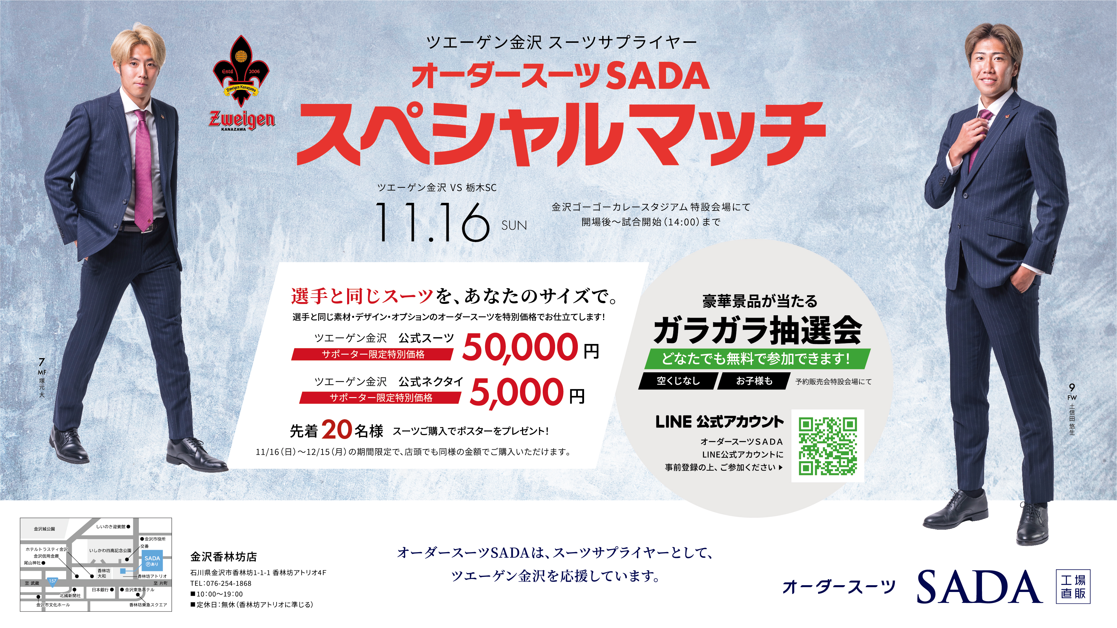 11月16日(日)栃木SC戦は、「オーダースーツSADA SPECIAL MATCH」開催!