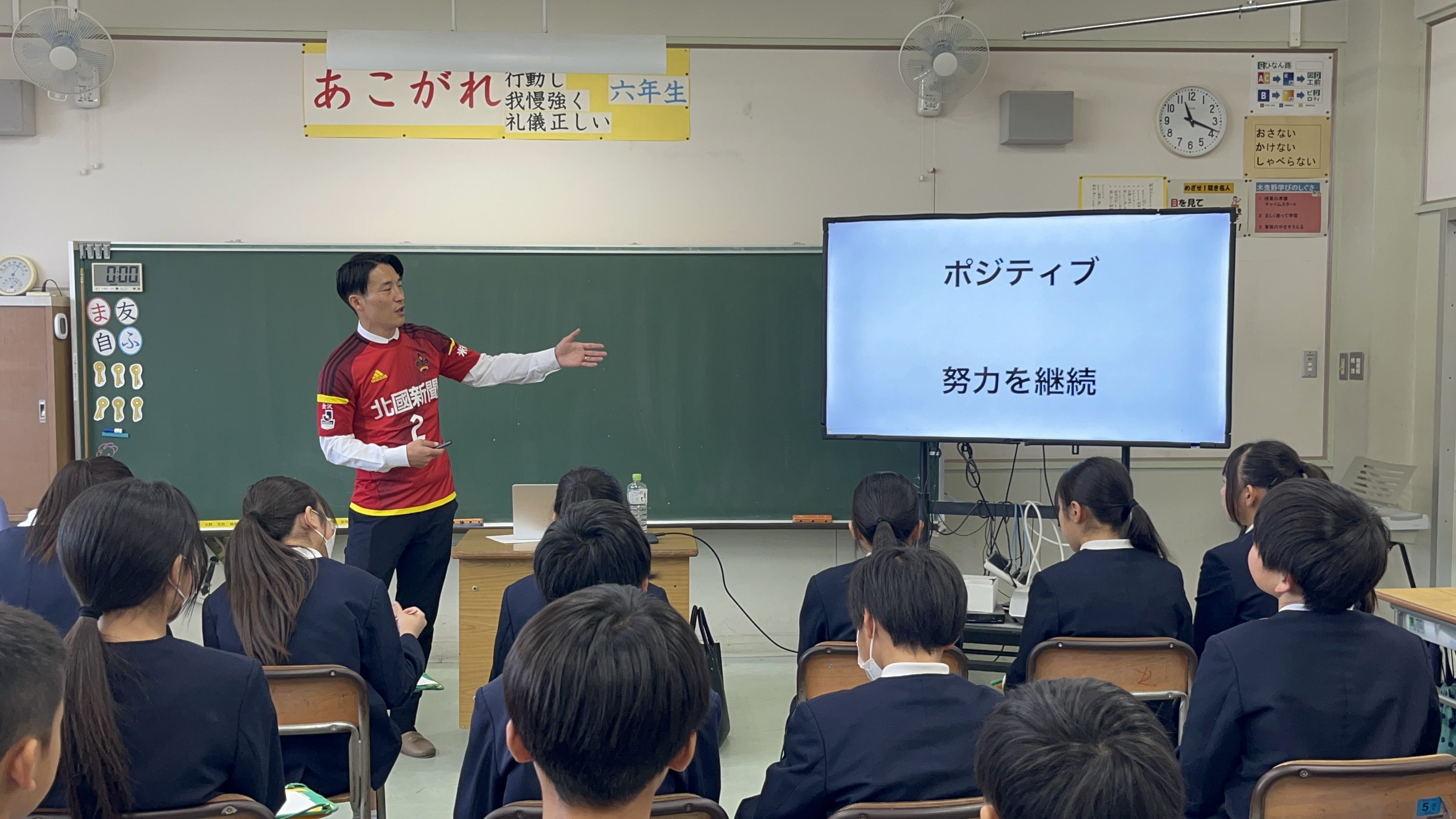 ツエーゲン金沢のフロントスタッフやアカデミースタッフが県内小・中学校の授業に参加し、職業講話を行っています。