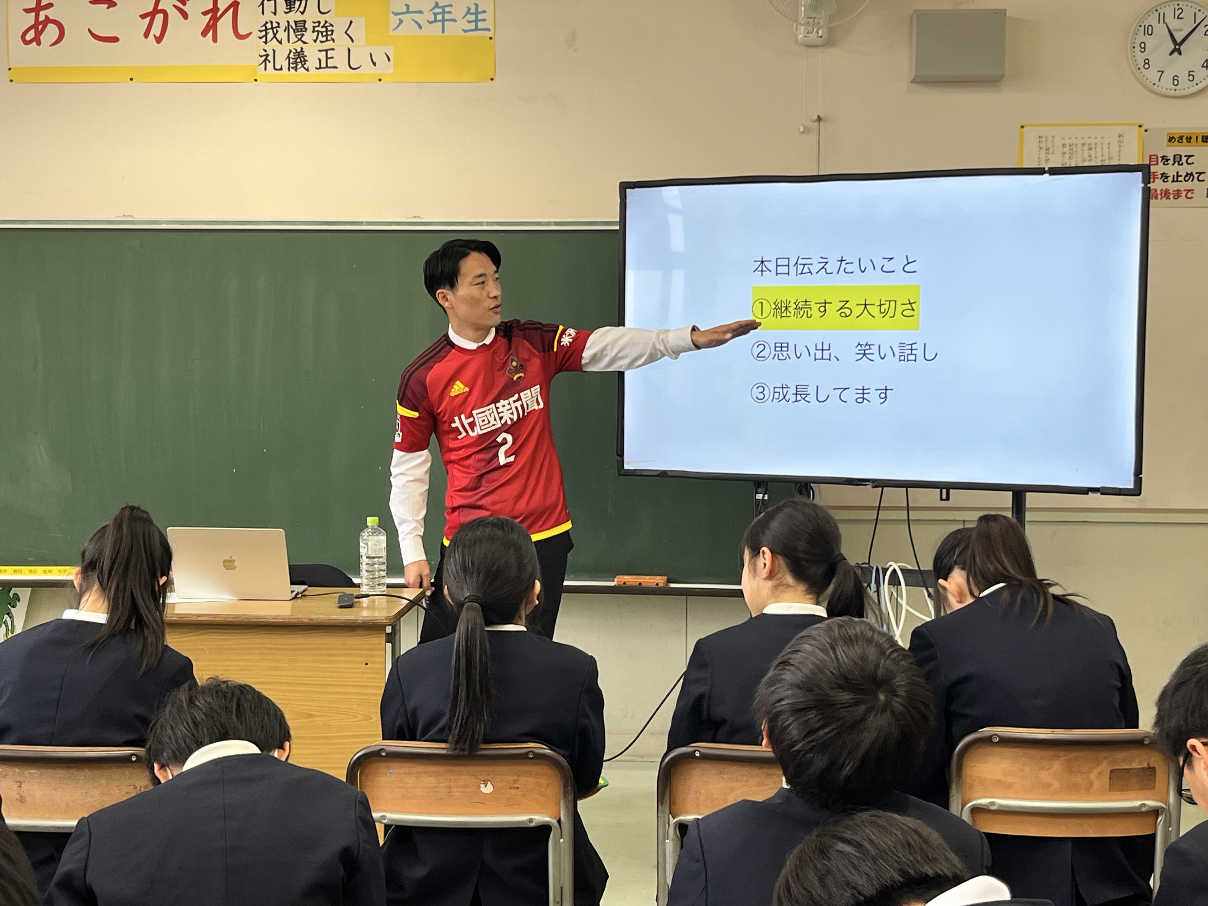ツエーゲン金沢所属時代のユニフォームに身を包み、生徒の皆さんと積極的に対話をしながら、約30分間自身の現役時代のサッカーに対する思いや、大切にしている考え方などを伝えました。