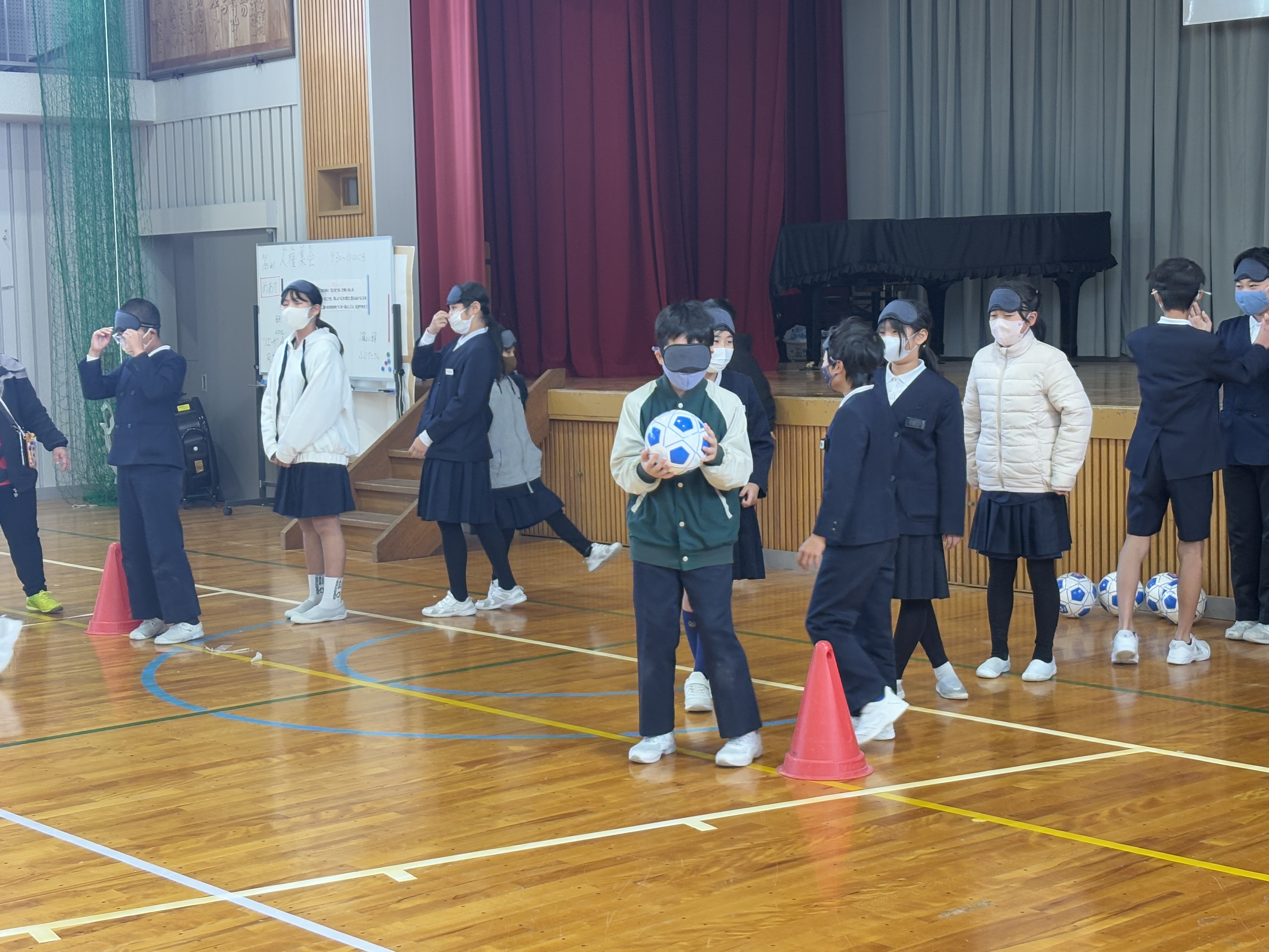 デモンストレーションの後に、高学年の生徒は実際にアイマスクをつけて、ボールを触ってもらいました。