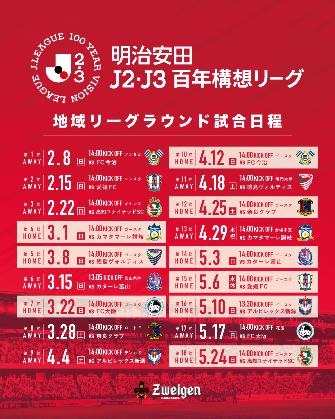 また合わせて、日程が未定だった第14節・第18節についても、それぞれ決定いたしましたのでお知らせいたします。