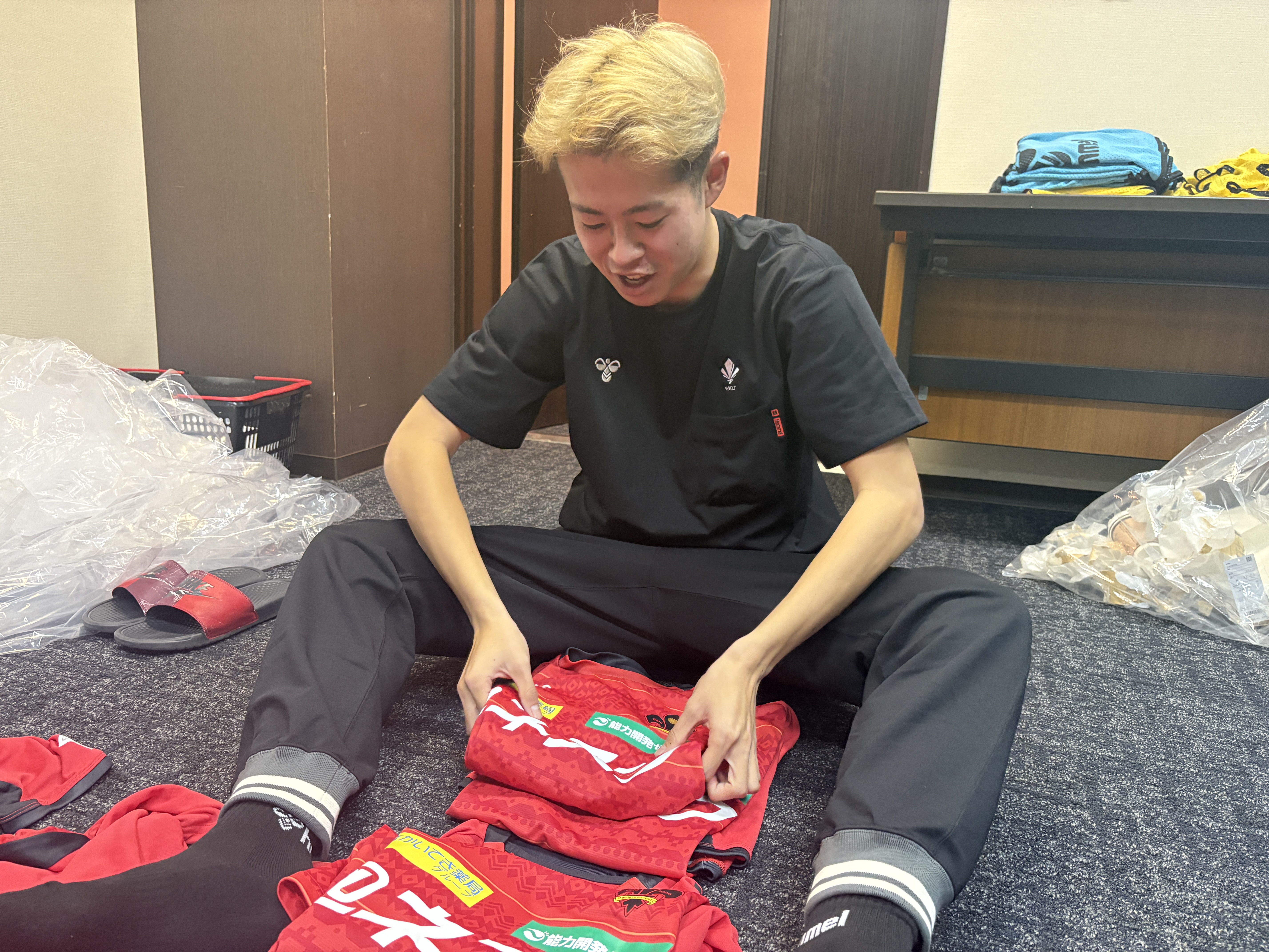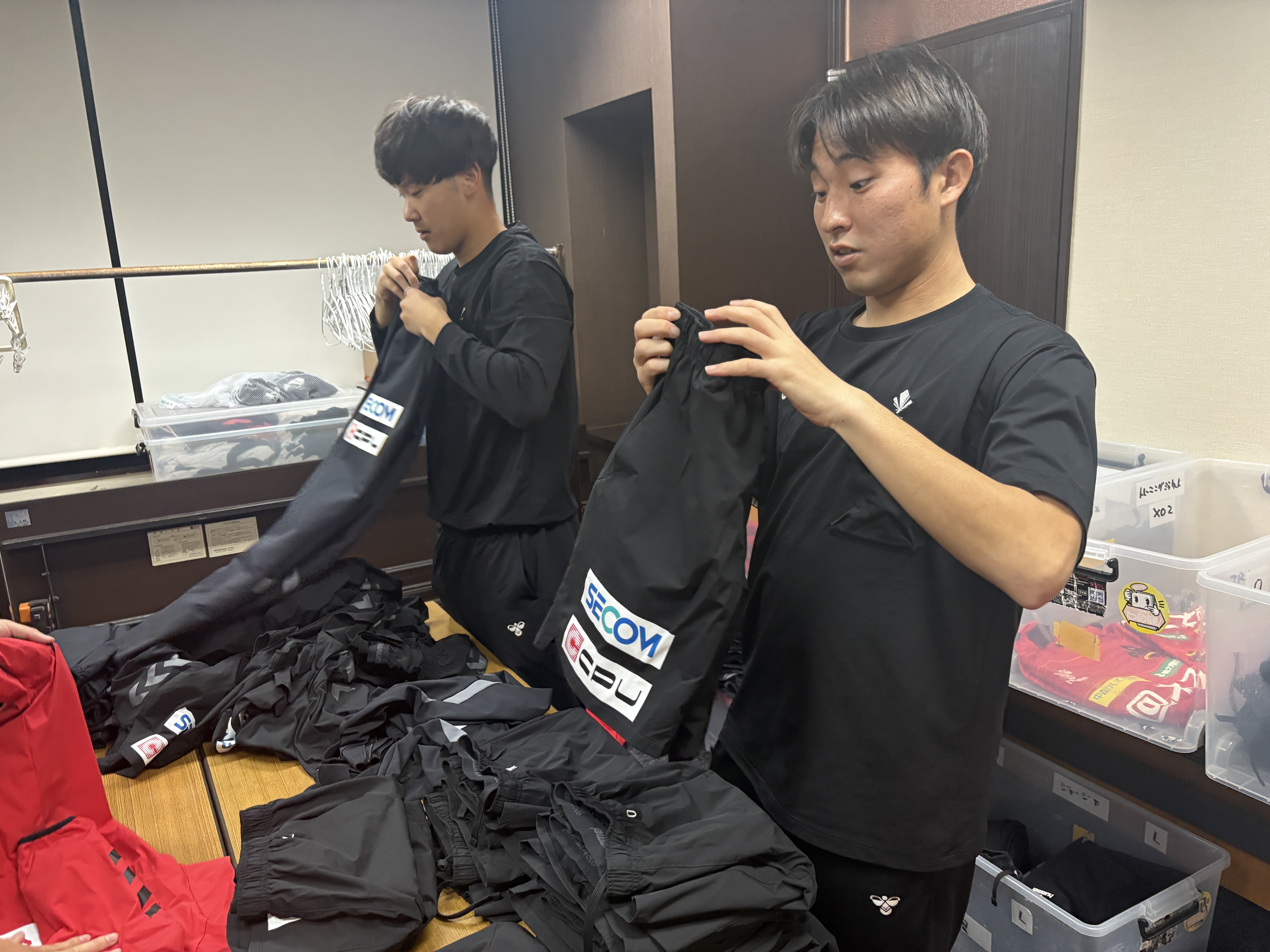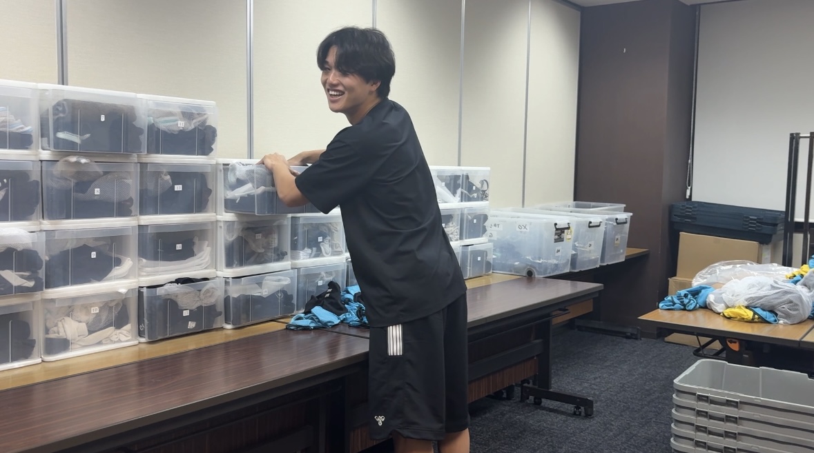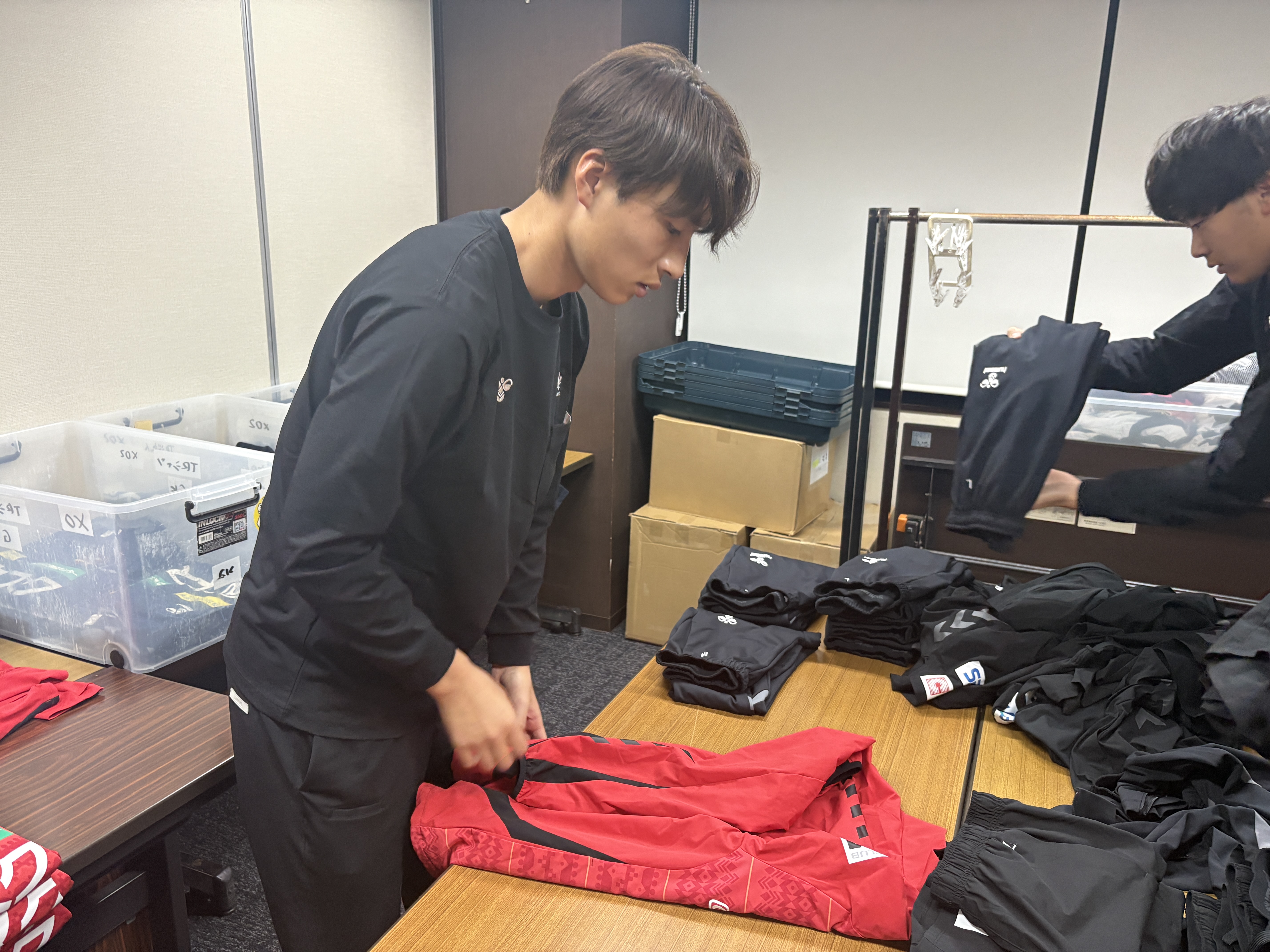 毎日大量の練習着やビブスの洗濯が必要になるため、洗濯後にみんなで畳み大会です。