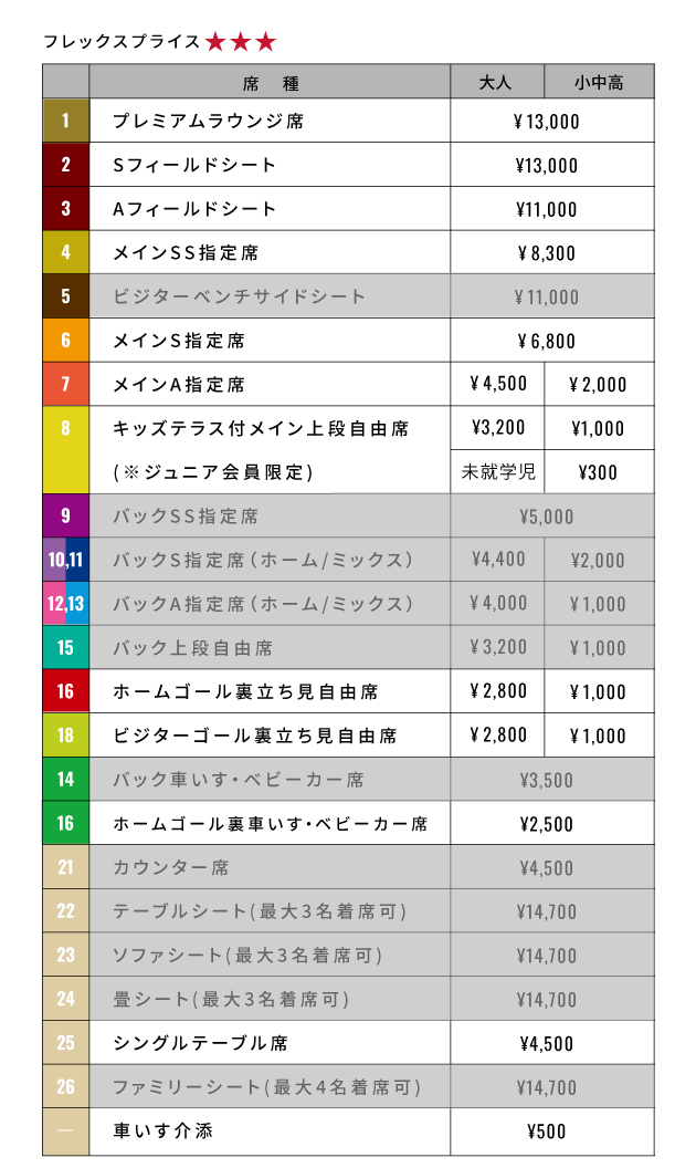 フレックスプライス制度とは対戦相手や時期など集客可能性に応じて価格を変動させ、より多くのファンサポーターの方のご来場と満足向上を目指すものです。