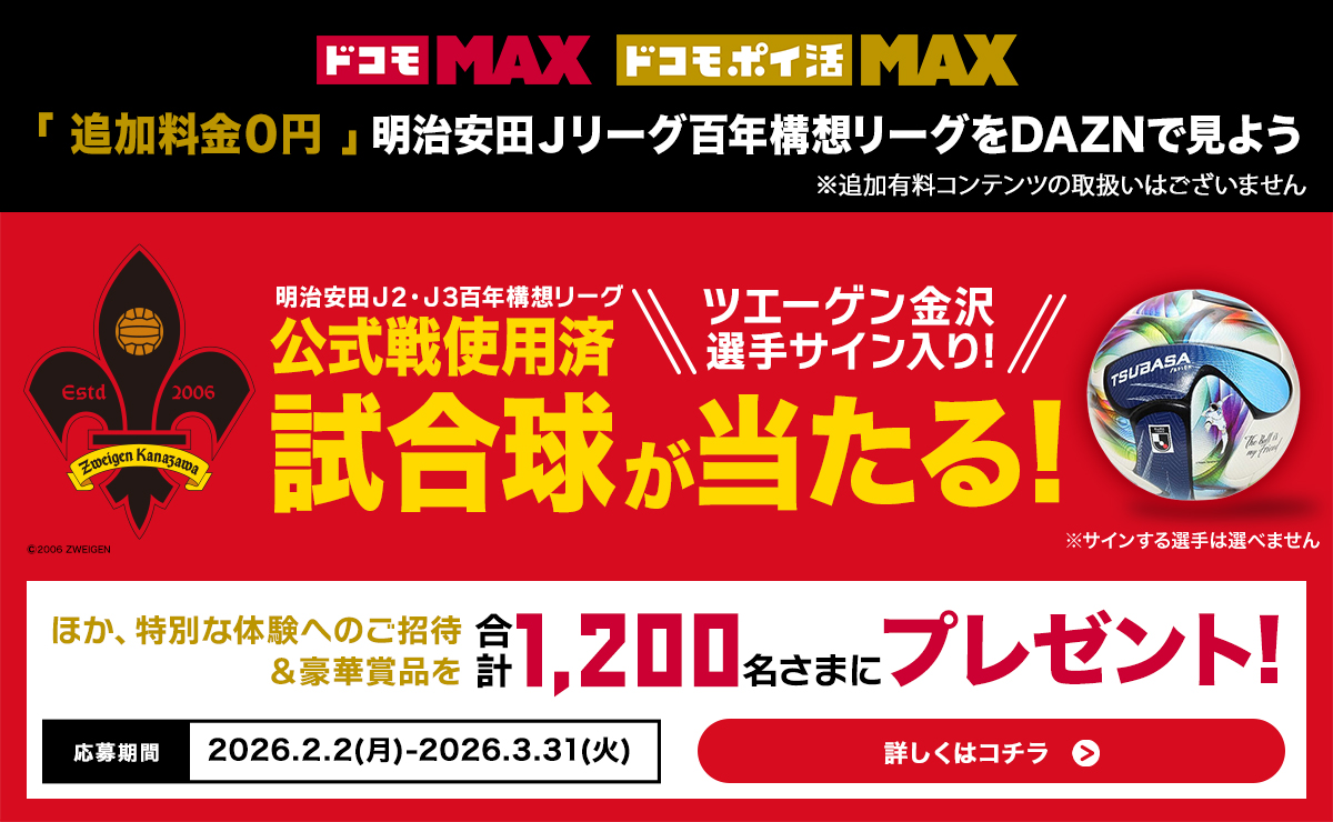 ツエーゲン金沢は、株式会社NTTドコモとの協業により、「ドコモ MAX」「ドコモ ポイ活 MAX」ご契約者様を対象としたキャンペーンを、以下の通り実施いたします。スタジアムツアーや全クラブユニフォームに加えて、ツエーゲン金沢からはサイン入り公式球をプレゼントいたします。