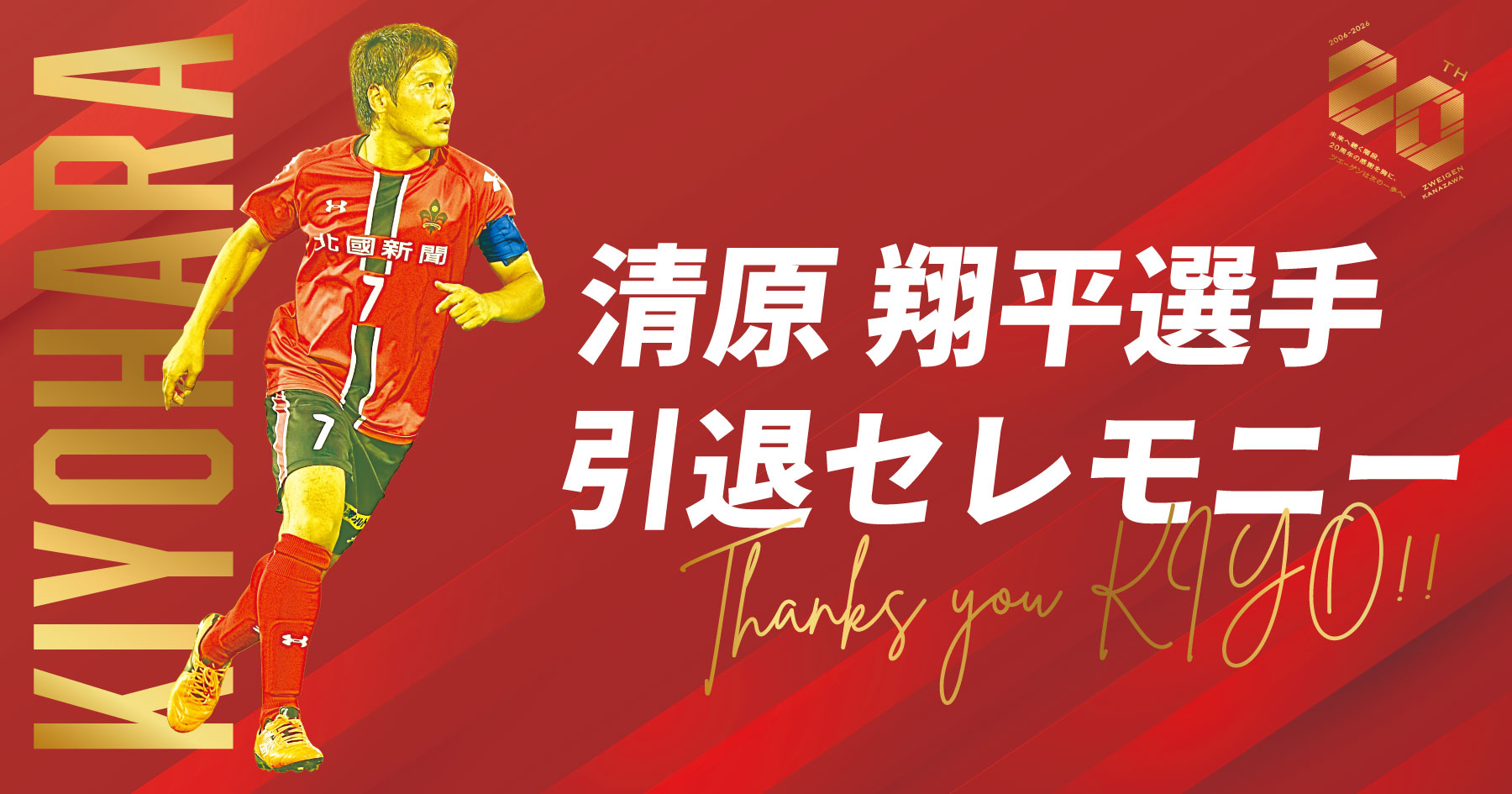 清原選手は2013〜2015年、2018〜2019年の計5シーズンにわたりツエーゲン金沢に在籍し、JFL・J3・J2の全カテゴリーでクラブの躍進を牽引した功労者です。