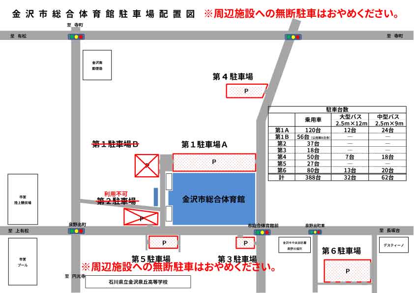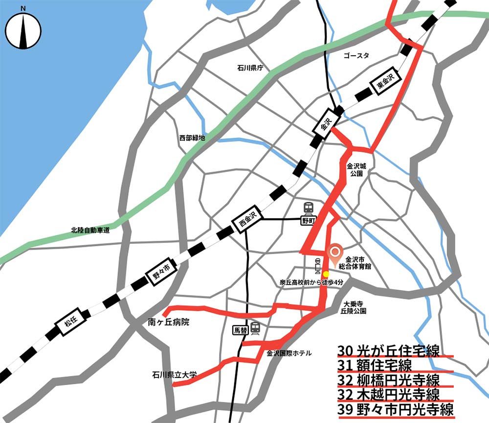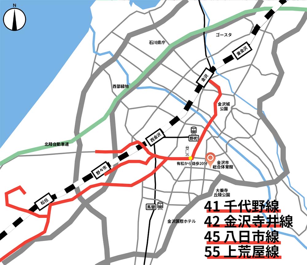 ■アクセス方法金沢市総合体育館は駐車場に限りがございます。できる限り、公共交通機関でのご来場をお願いいたします。