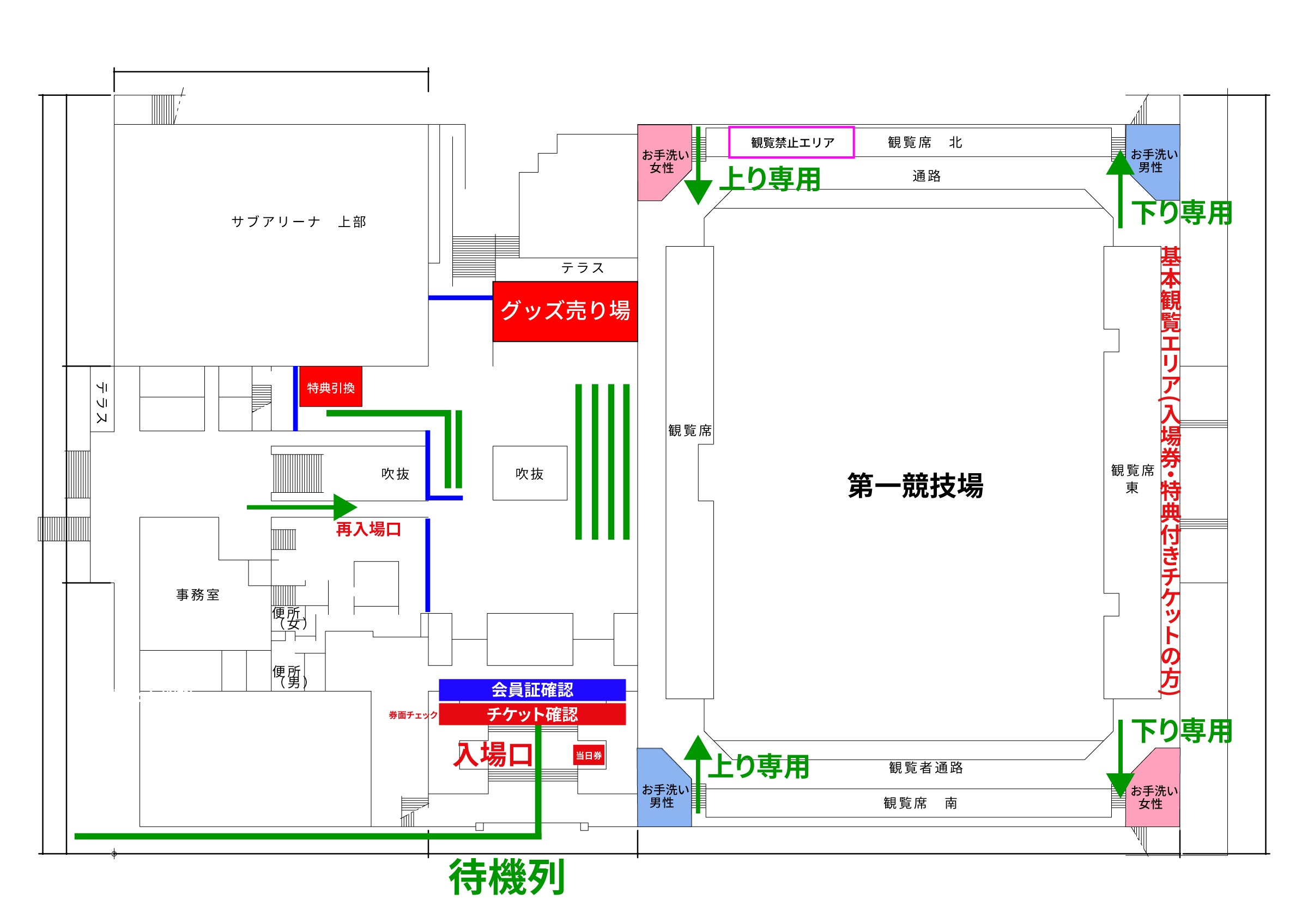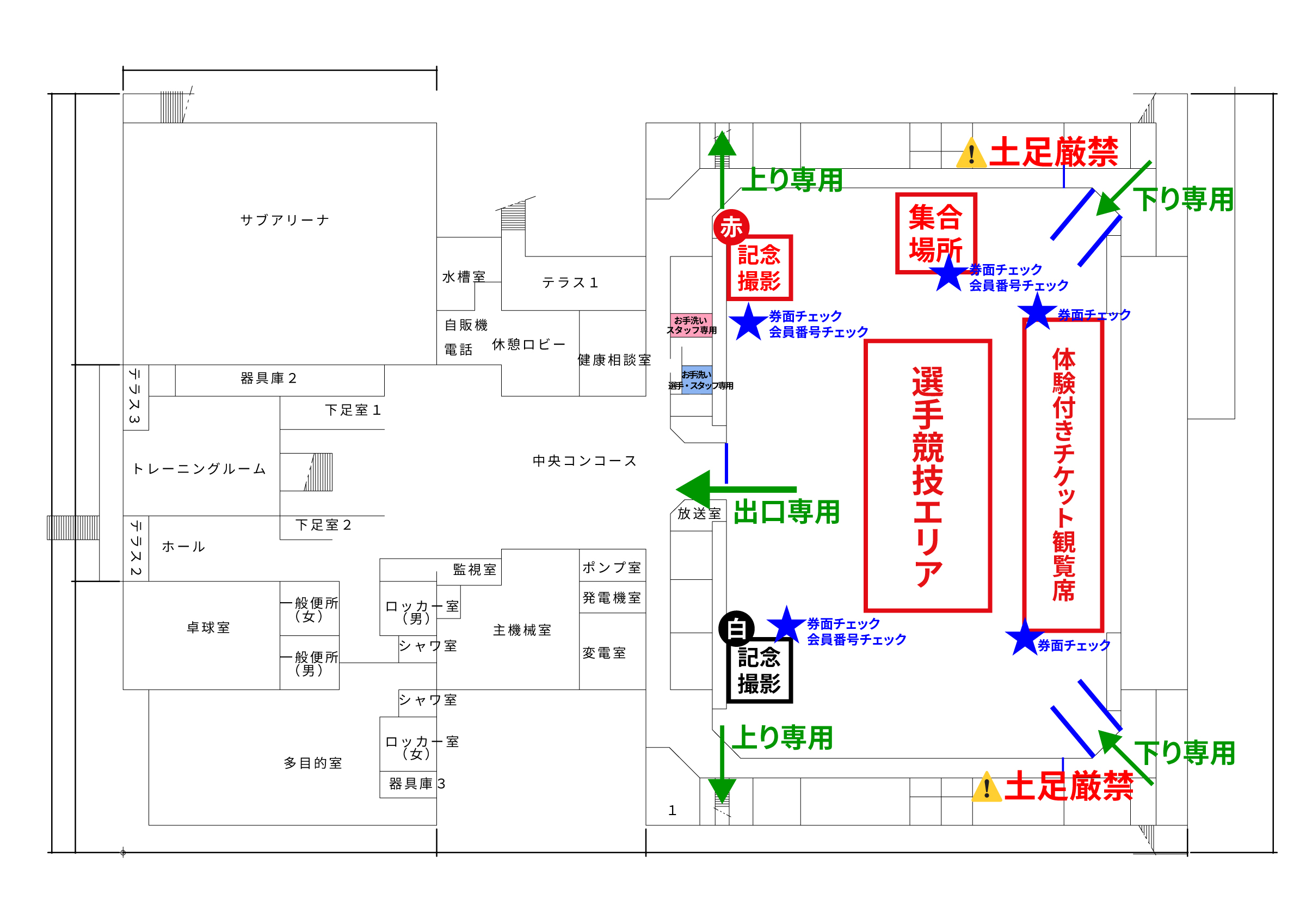 ★マーク:券面チェック・会員証チェックが必要な場所です。 当日は忘れないようにお持ちください。◾️1階への移動について2階の観客席から、1階体育館内に降りる際は図の右側の階段をご利用ください。階段は狭くなっておりますので、下り専用・上り専用に分かれております。また、1階に降りる際は2階の観客席にて履き物を変えていただくと、スムーズに1階観覧席にご入場いただけます。◾️お手洗いについて1階のお手洗いは、関係者専用となっております。お手数ですが、お手洗いは2階観覧席の四隅をご利用ください。