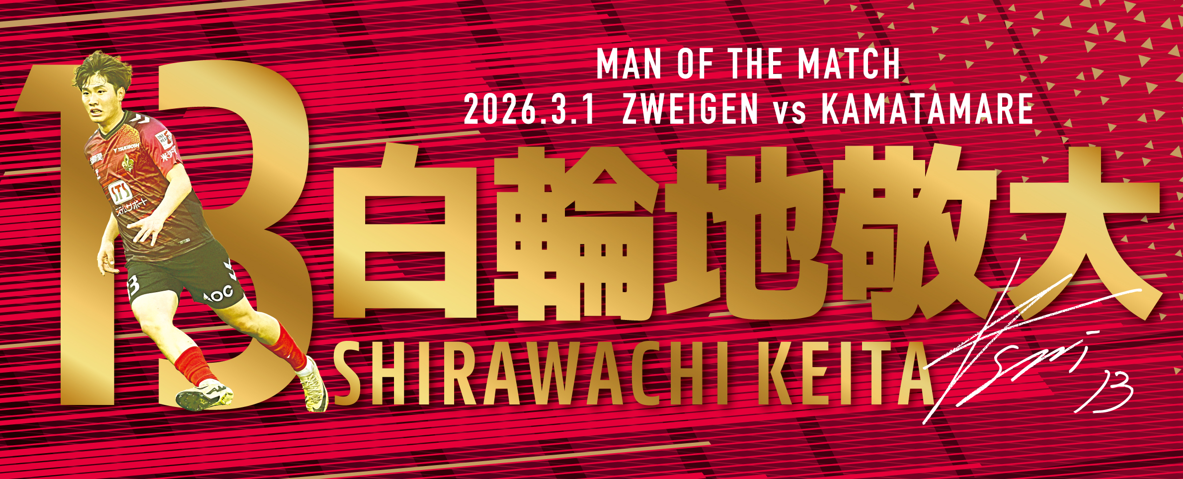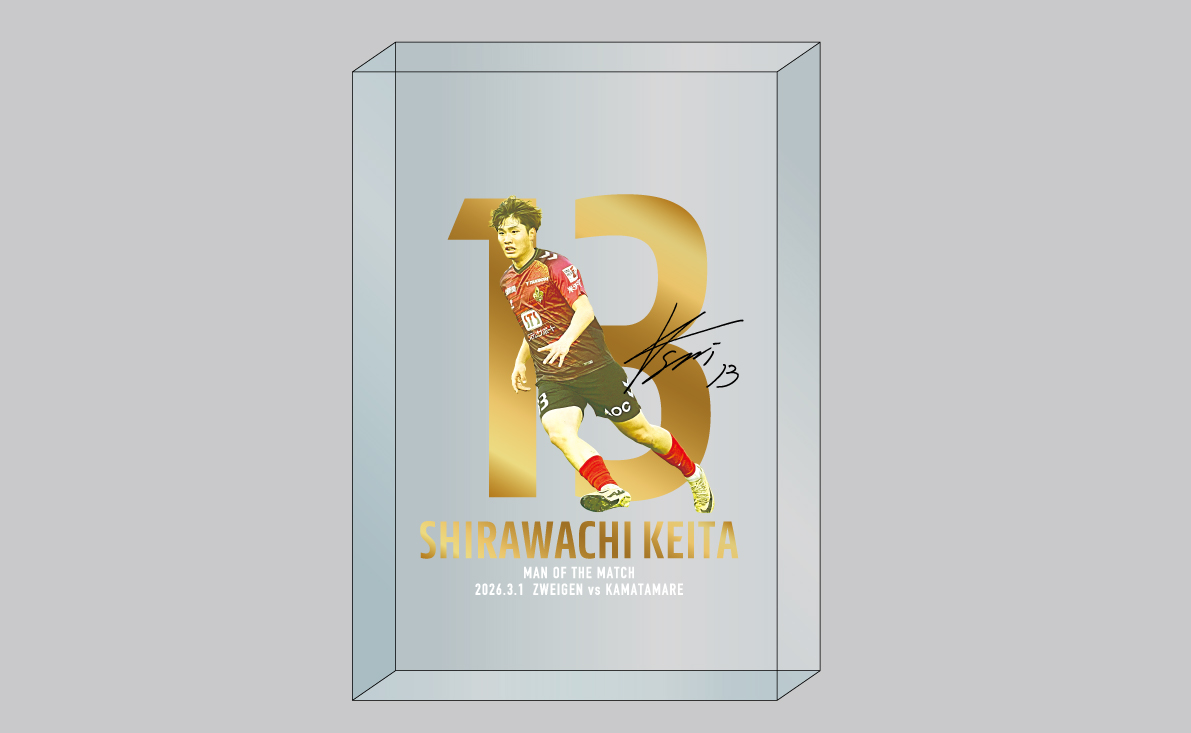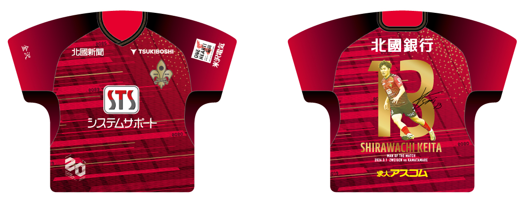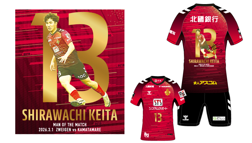 明治安田J2・J3百年構想リーグ第2回目の勝ちユニのデザインになる選手は、フォワードの背番号13番 白輪地 敬大選手に決定!