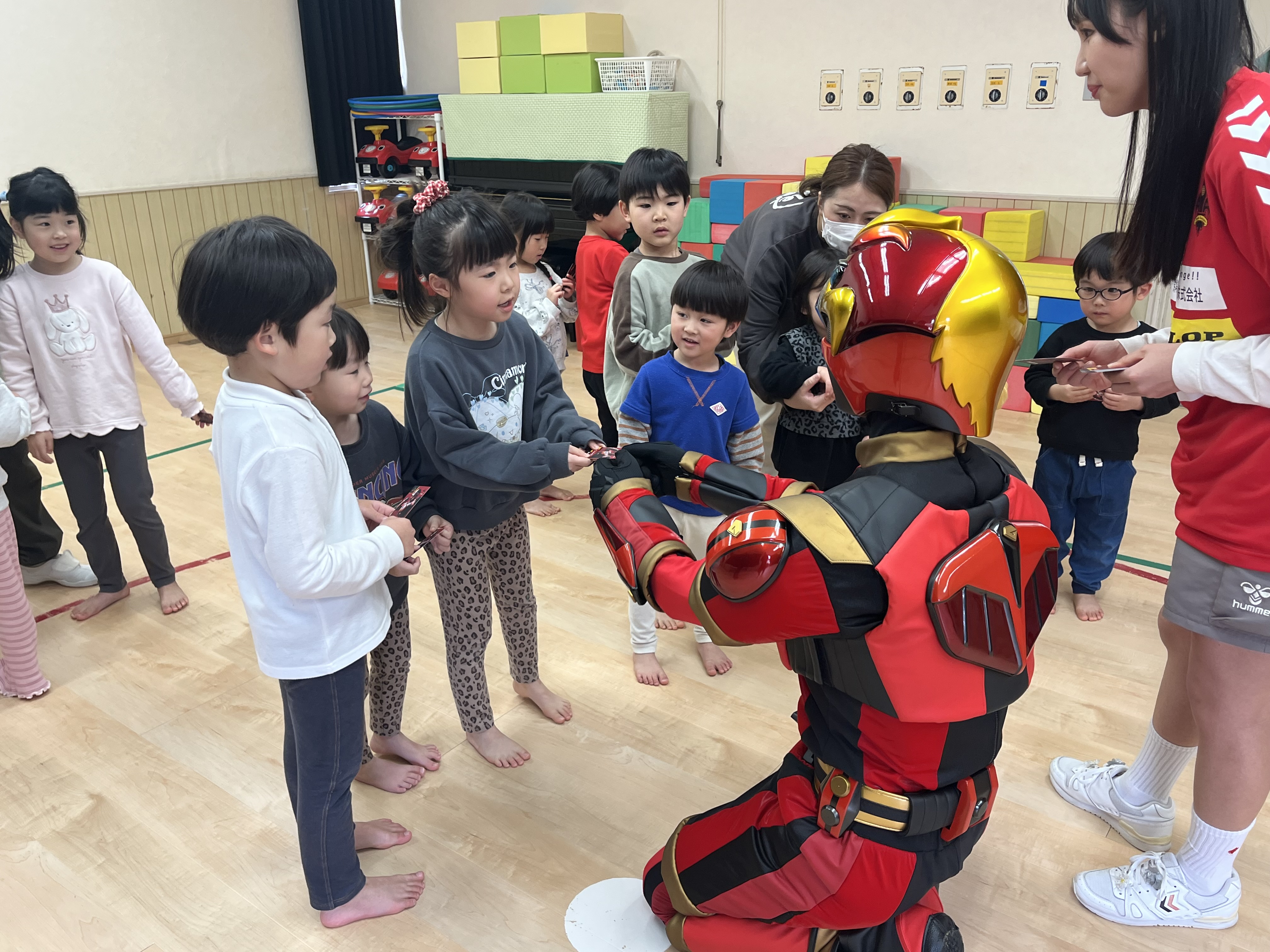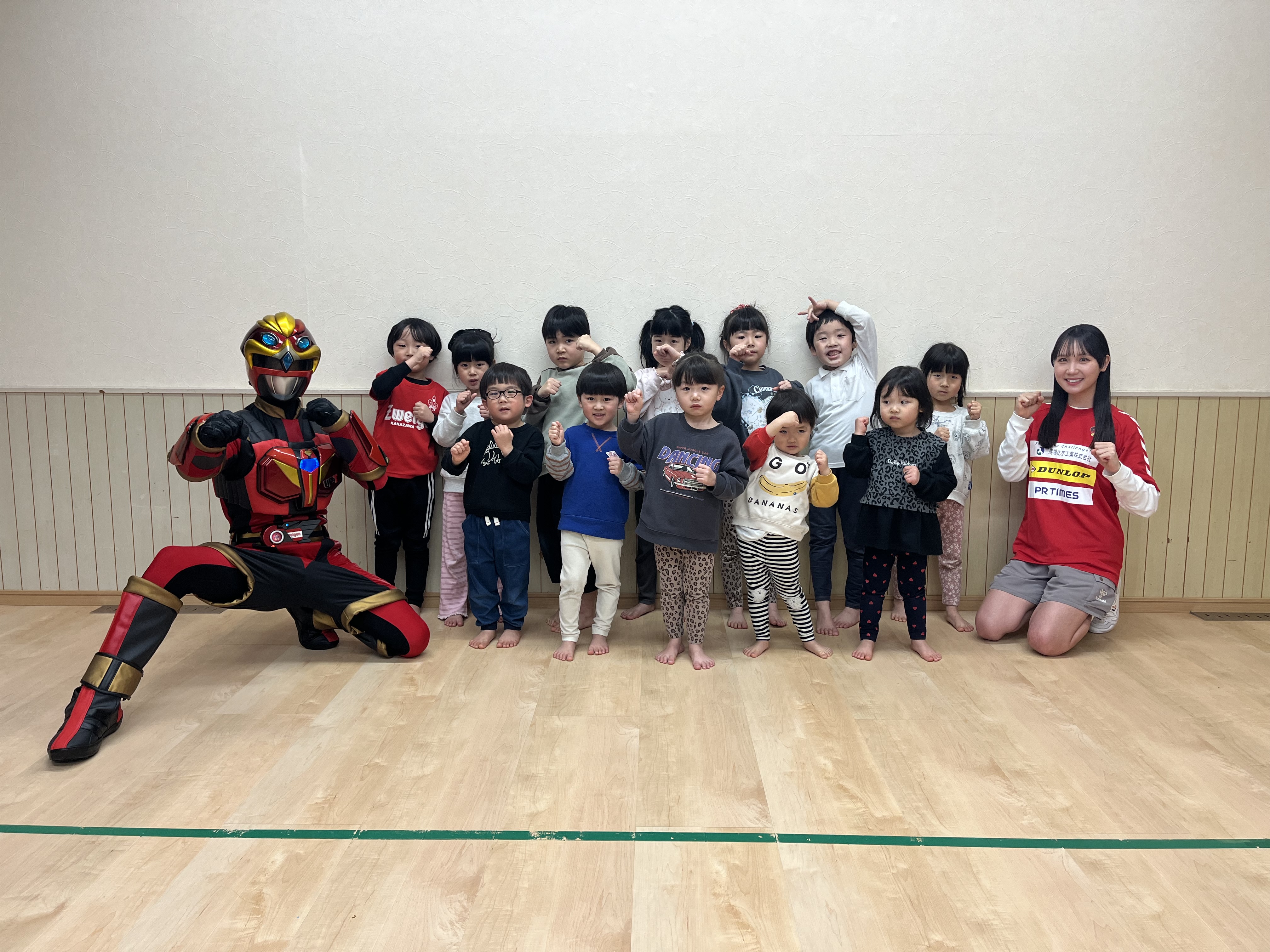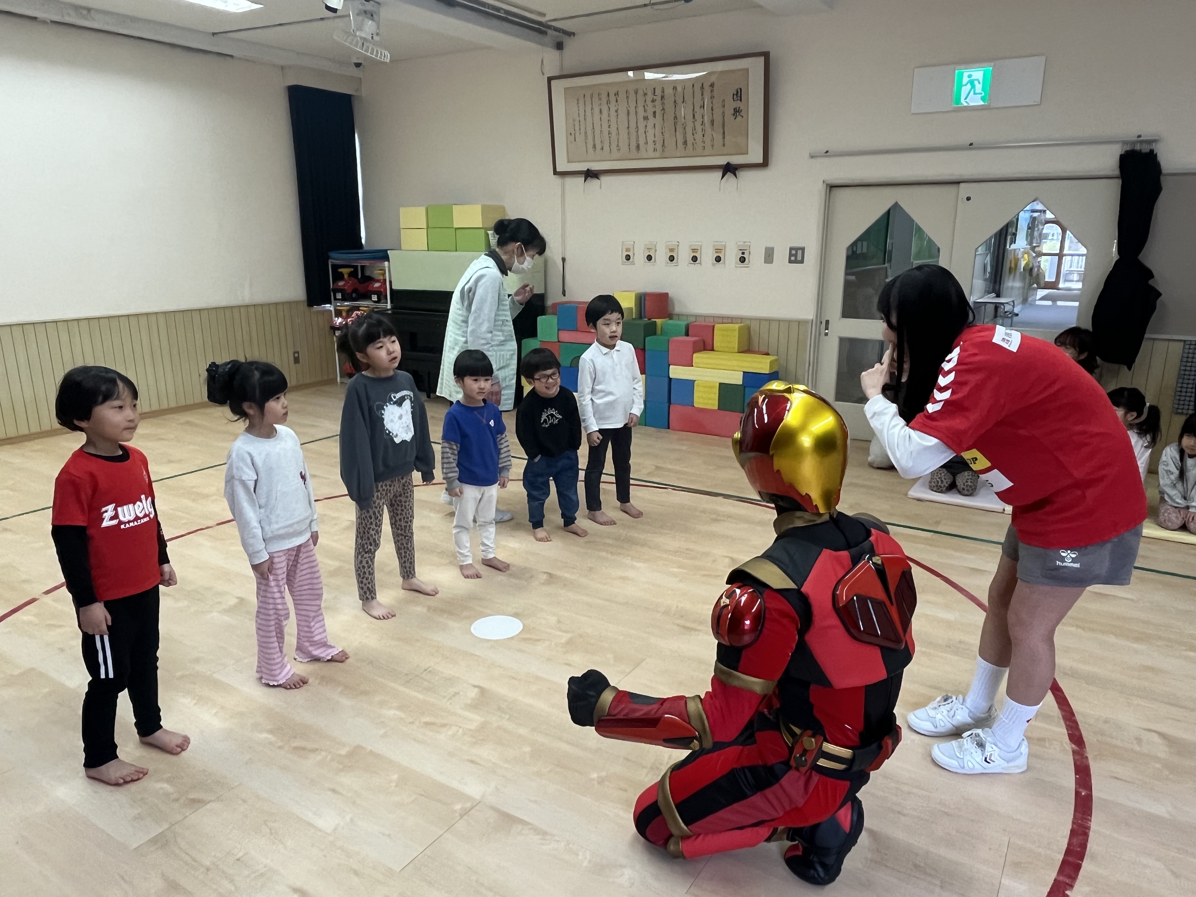 マスコットのゲンゾイヤーとほくりくアイドル部 辰巳未来春さんが訪問し、園の皆さんと交流・ゲンゾイヤー体操を踊りました。