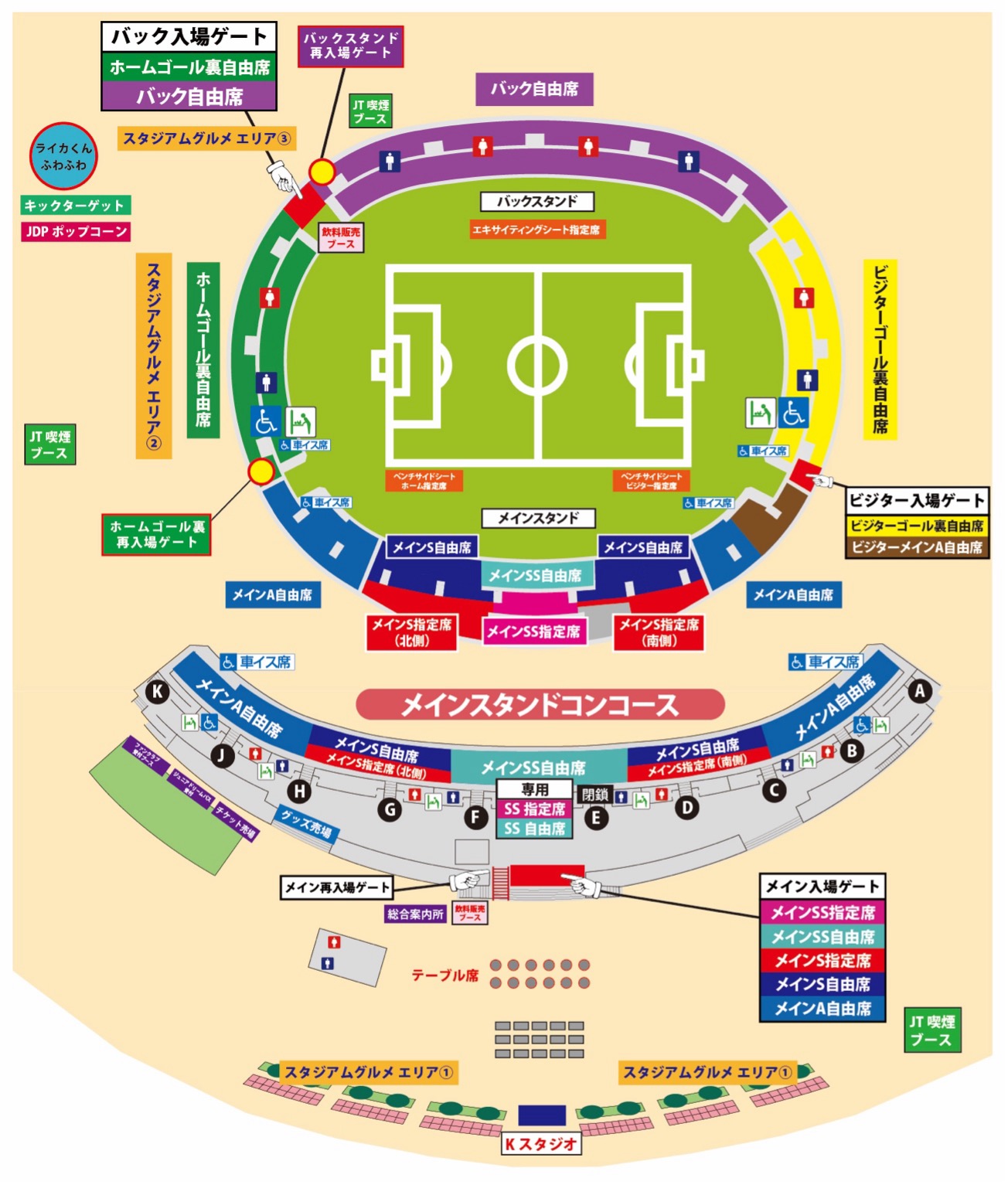 ・ビジター応援席・ビジターメインA自由席・ベンチサイドシート ビジター指定席でご観戦の方は「ビジター再入場ゲート」より再入場可能です。再入場の際は「チケット(QRチケット等)」必ずお持ちください。