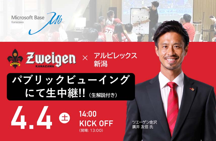 この度、パートナー企業システムサポート様が運営するコワーキングスペース「マイクロソフトベース金沢」にて、4月4日(土)アウェイアルビレックス新潟戦のパブリックビューイングを実施することとなりましたので、お知らせいたします。