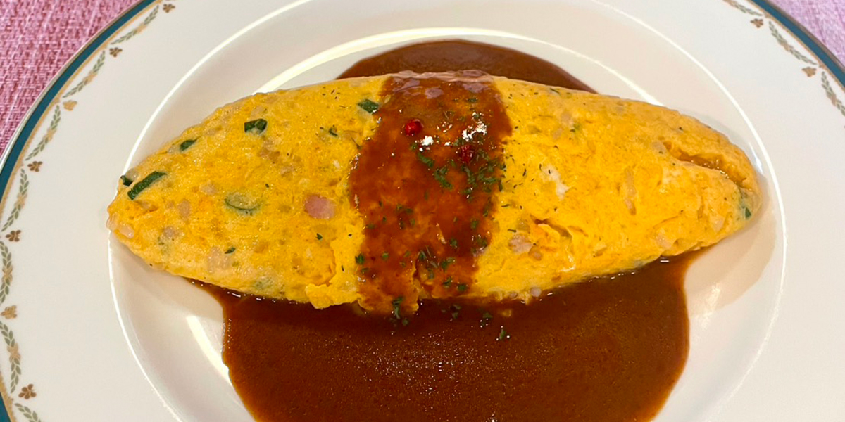 たまごとライスをふわふわのライスオムレツ仕上げました。自家製デミグラスソースといっしょにふわふわ食感をお楽しみください。