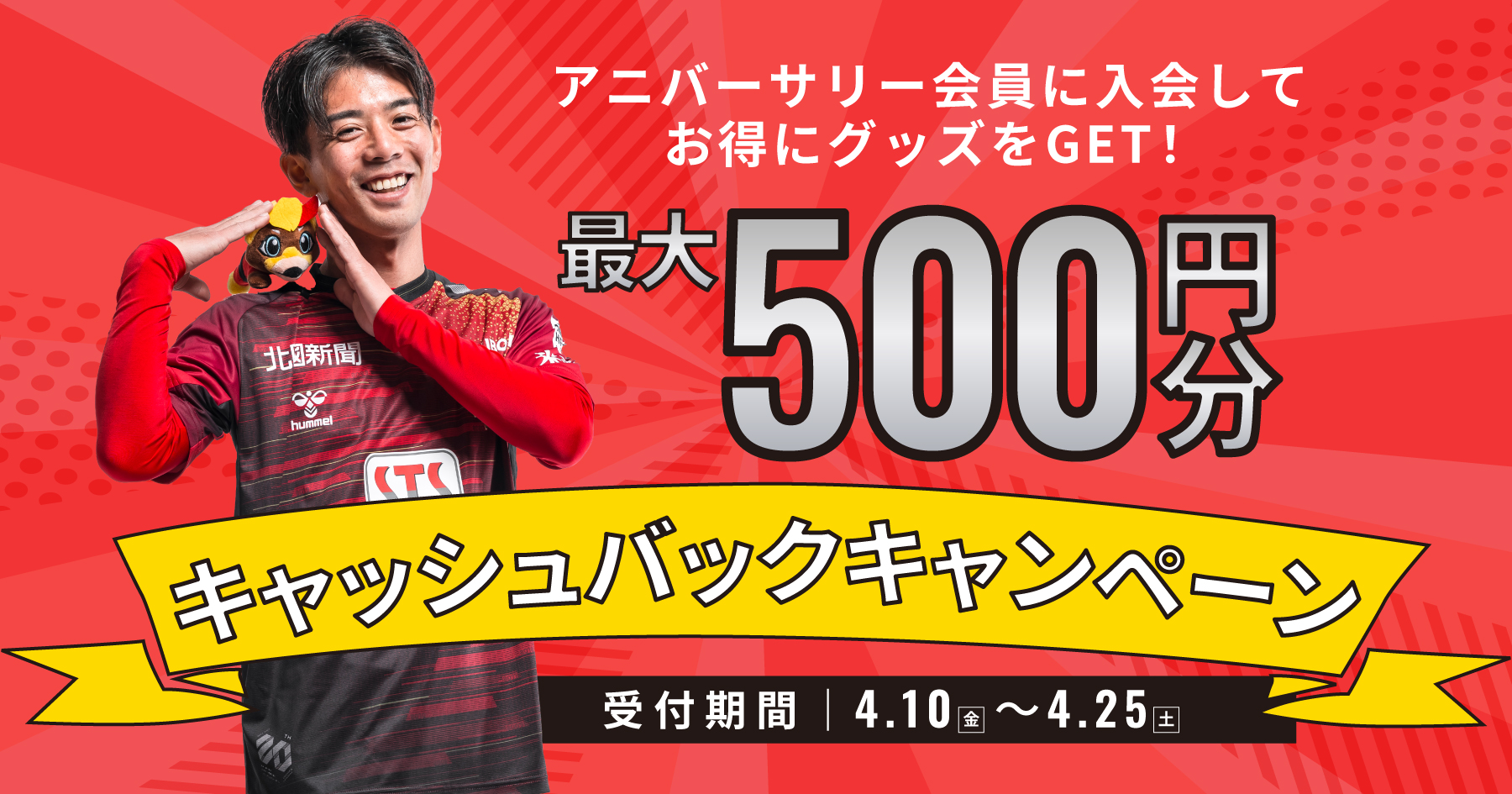 この度、ツエーゲン金沢「アニバーサリー会員」では、「キャッシュバック!入会キャンペーン」を実施することとなりました。期間中にアニバーサリー会員にご入会いただいた方には、試合会場のグッズ売り場でご利用いただける割引券をキャッシュバック!このオトクな機会にぜひご入会ください!