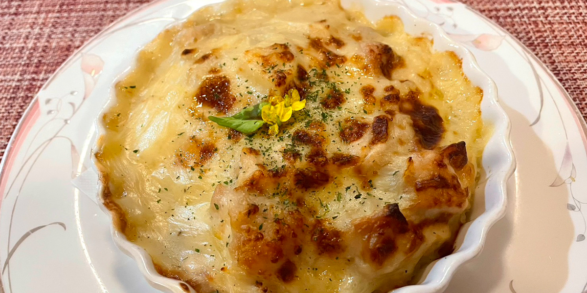 シャキッとした金沢産たけのことチキンをたっぷり使い、コクのある特製ホワイトソースでボリューム満点に仕上げました。とろ~りとろけるチーズといっしょにご賞味ください。
