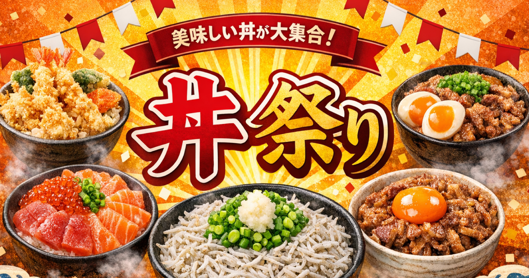 ボリュームたっぷりの肉丼や天丼、ローストビーフ丼にカレーライス、ハントンライスも!数々のグランプリを受賞した人気の丼が久々の登場!魅力たっぷり勢ぞろいの丼祭りでお腹いっぱいお楽しみください。