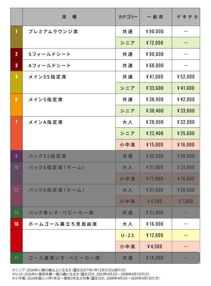 ◾︎席種:メインスタンドの一部「プレミアムラウンジ席、メインSS指定席、メインS指定席、メインA指定席