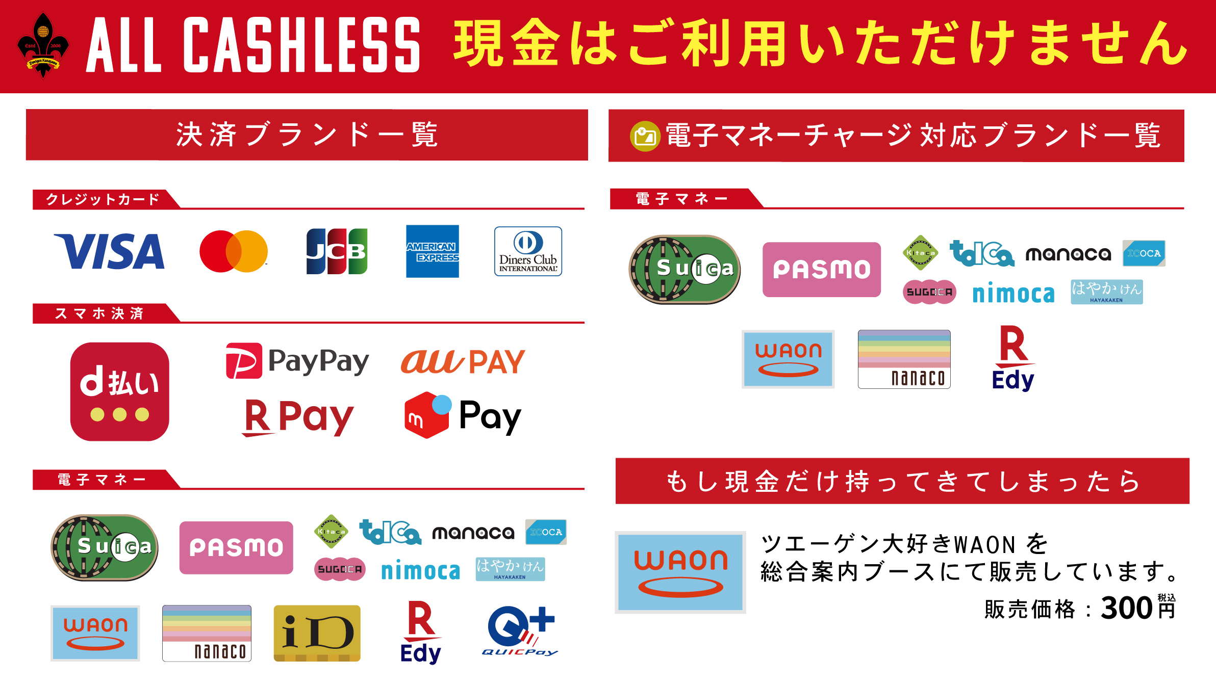 場外キッチンカーをはじめ、スタジアムの各店舗はキャッシュレス化しております。2025開幕時点、チケット売り場のみ、現金をご利用いただけます。