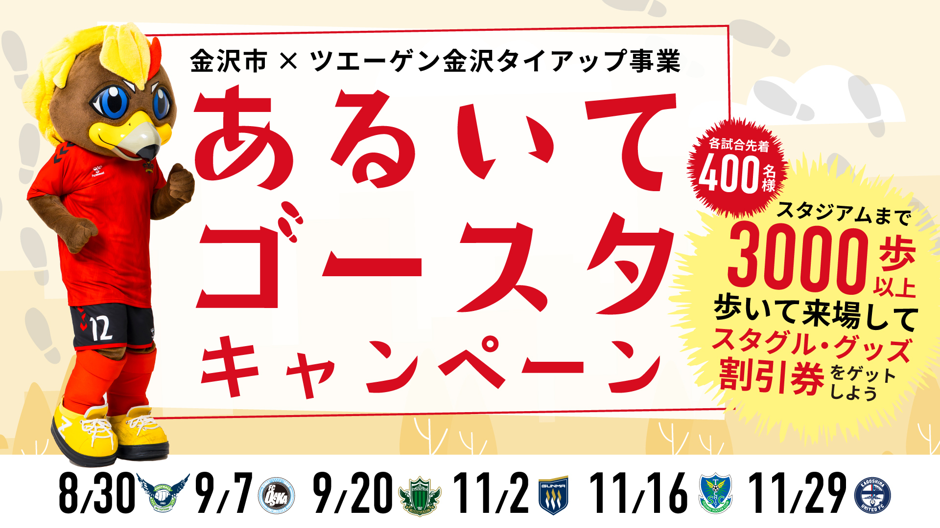 公共交通機関または徒歩でご来場の方で、プロジェクトアンケートに回答いただくと、当日試合会場で利用いただける「スタジアムグルメ・ツエーゲン金沢グッズ」の割引券を先着400名様にプレゼント!