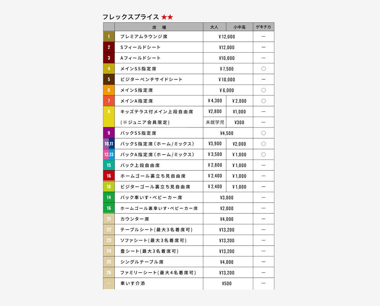 【ゲキチカ】エリアとは、メイン・バックの最前2列もしくは3列が対象です。通常価格から+300円〜+500円での販売となります。