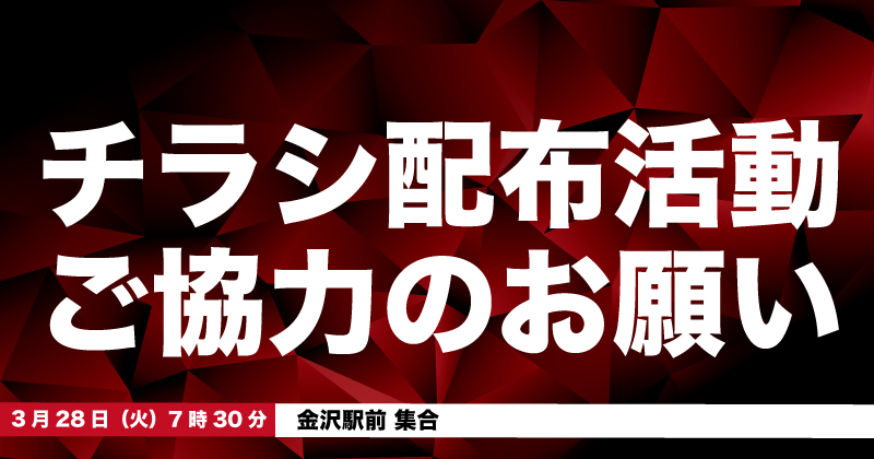 ついては日頃より応援いただく皆様の中で、3月28日(火)7:30〜8:30にて、試合告知チラシの配布活動にご協力いただける方を募集いたします!