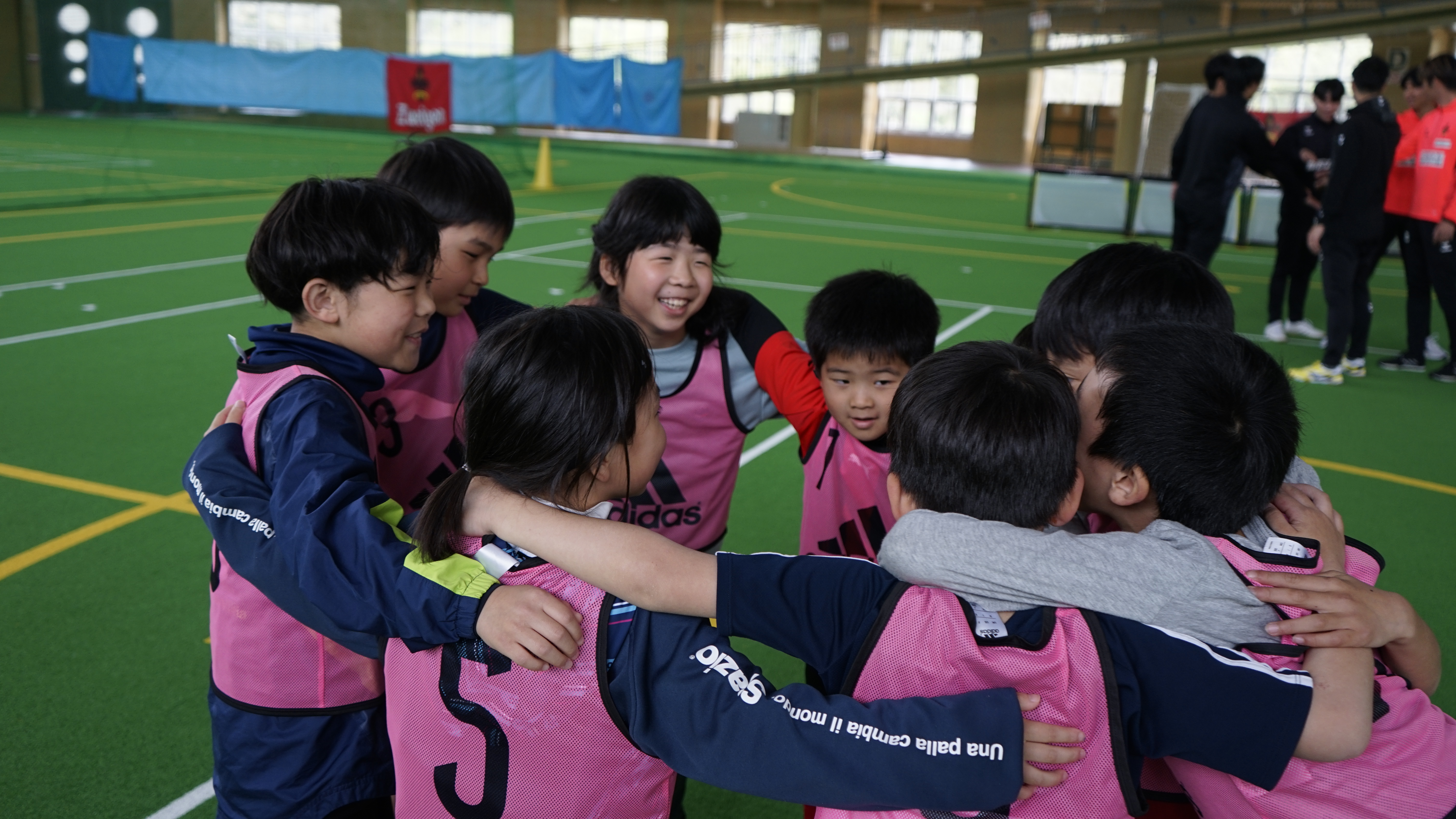 選手・コーチvs子どもたちのミニゲームは円陣を組んでからスタート!