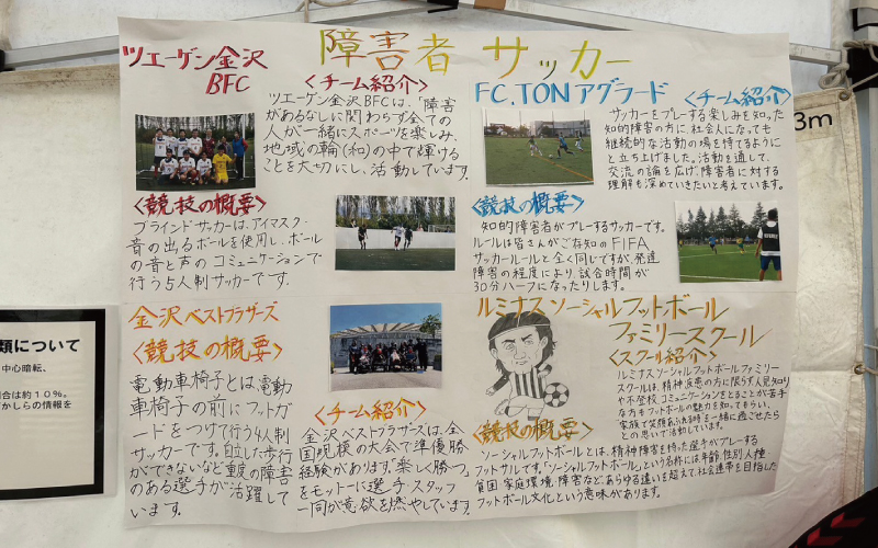 また、啓発コーナーの方では、県内のパラフットボールチームを紹介するコーナーや、色盲や視野狭窄など様々な視覚障害を体験できるメガネを設置。