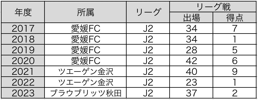 城南中 - 大阪桐蔭高 - 明治大 - 愛媛FC - ツエーゲン金沢 - ブラウブリッツ秋田(期限付き)