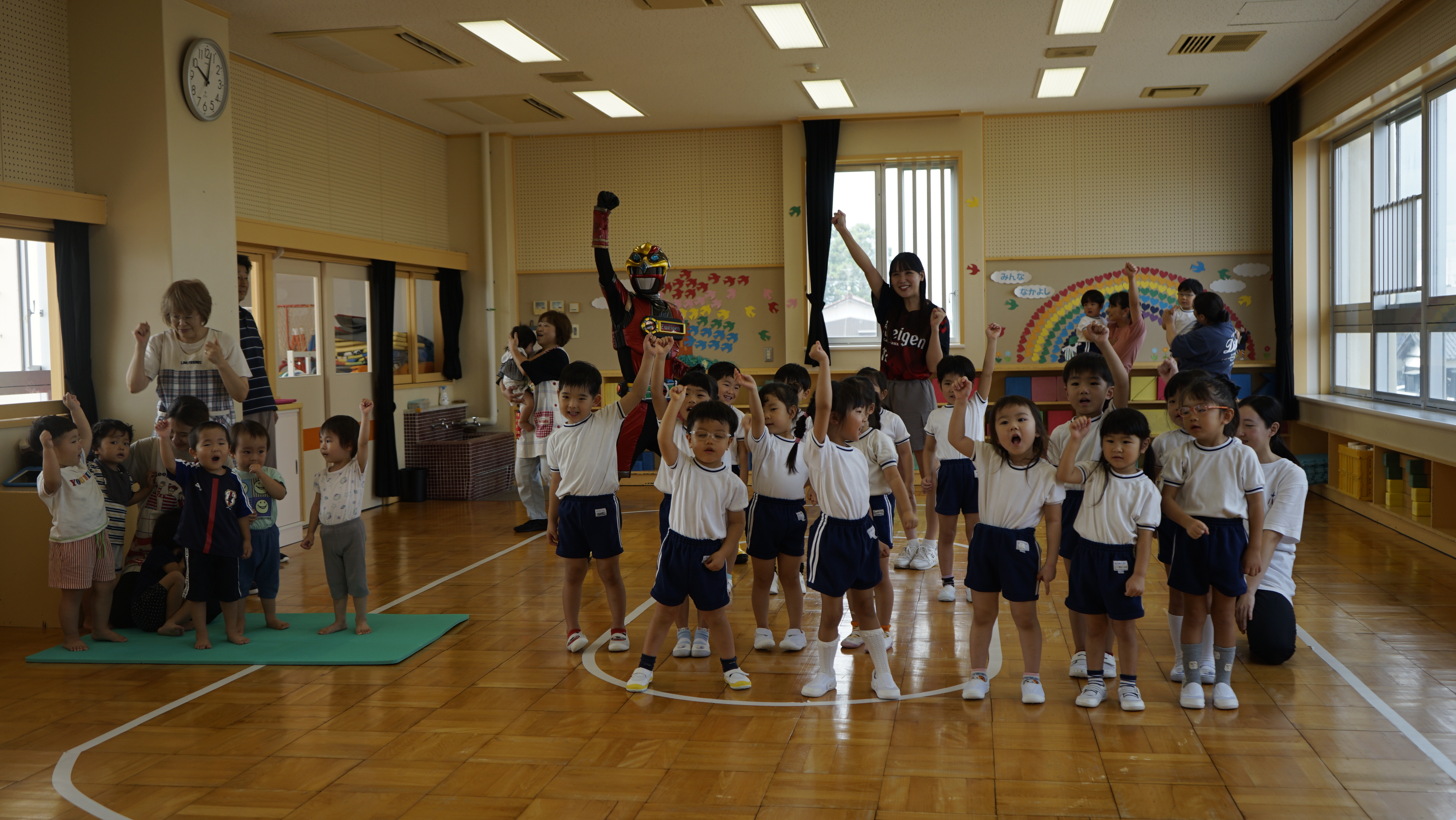 マスコットのゲンゾイヤーとほくりくアイドル部 辰巳未来春さんが訪問し、園児たちと交流・ゲンゾイヤー体操を踊りました。