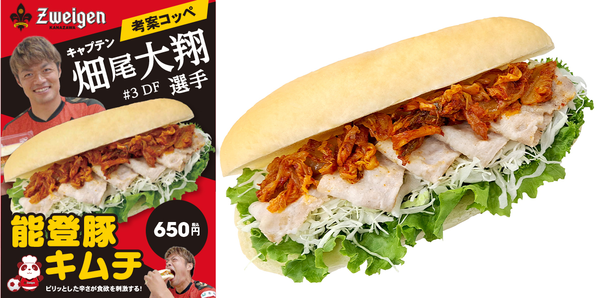 11月のホームゲームは『コッペ亭×選手コラボ』メニューを販売!第一弾は畑尾選手考案の能登豚キムチ!ピリッとした辛さが食欲を刺激します。