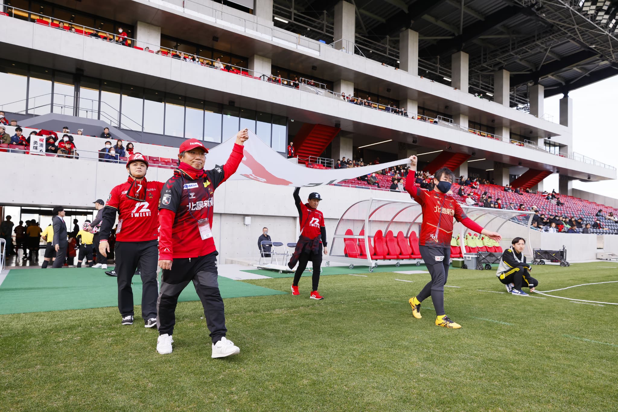 ピッチ上にてフラッグを振って、入場する選手達をお迎えいただきます。