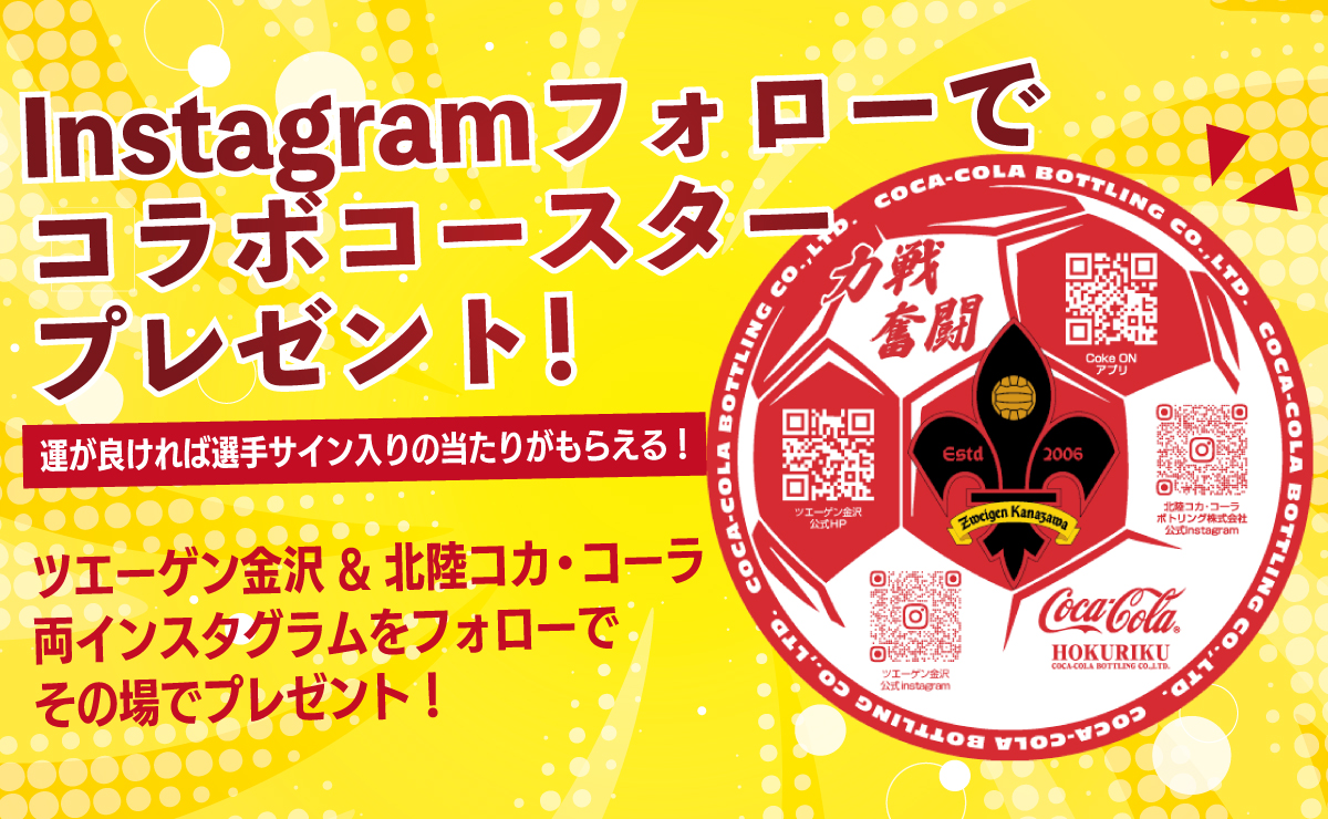 ツエーゲン金沢と北陸コカ・コーラのInstagramをダブルフォローしよう!ブースでフォロー画面をスタッフに提示すると、ツエーゲン金沢×コカ・コーラのオリジナルコースターをその場でプレゼント!運が良ければ、ツエーゲン金沢の選手たちの直筆サイン入りコースターがもらえる!