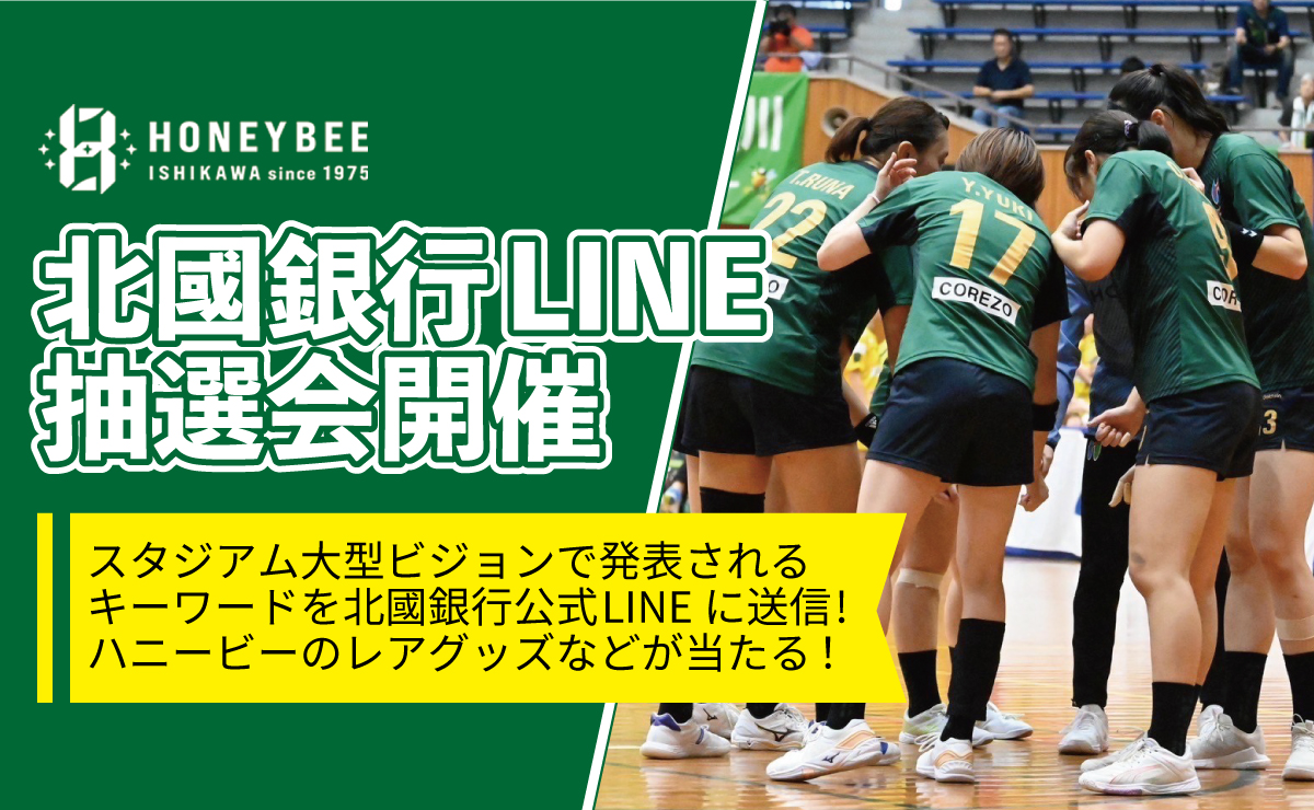 試合前・試合終了後などに大型ビジョンに掲示されるキーワードを北國銀行の LINE トーク画面に入力ください。見事当選された方には、ハニービーのレアグッズやツエ ーゲンのサイン入りグッズなど豪華景品をプレゼント!