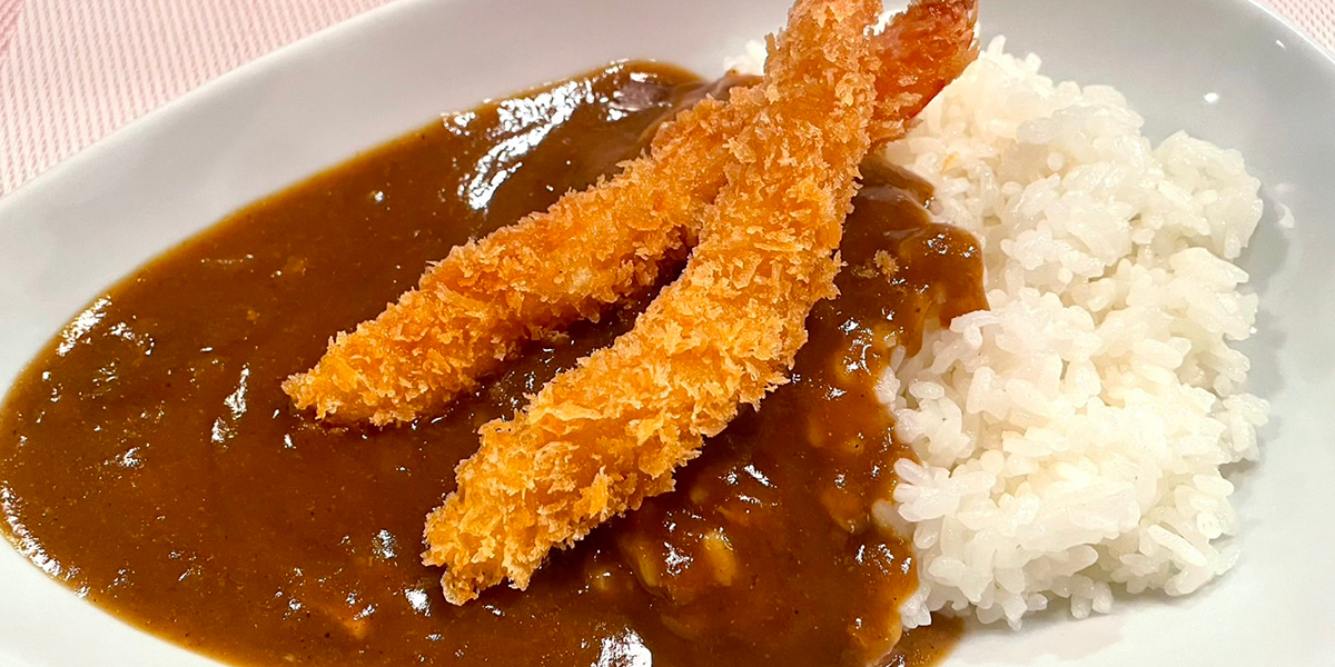 ビストロ風で大人気のエビフライをカレーにのせてボリューム満点に仕上げました。ぜひご賞味ください。