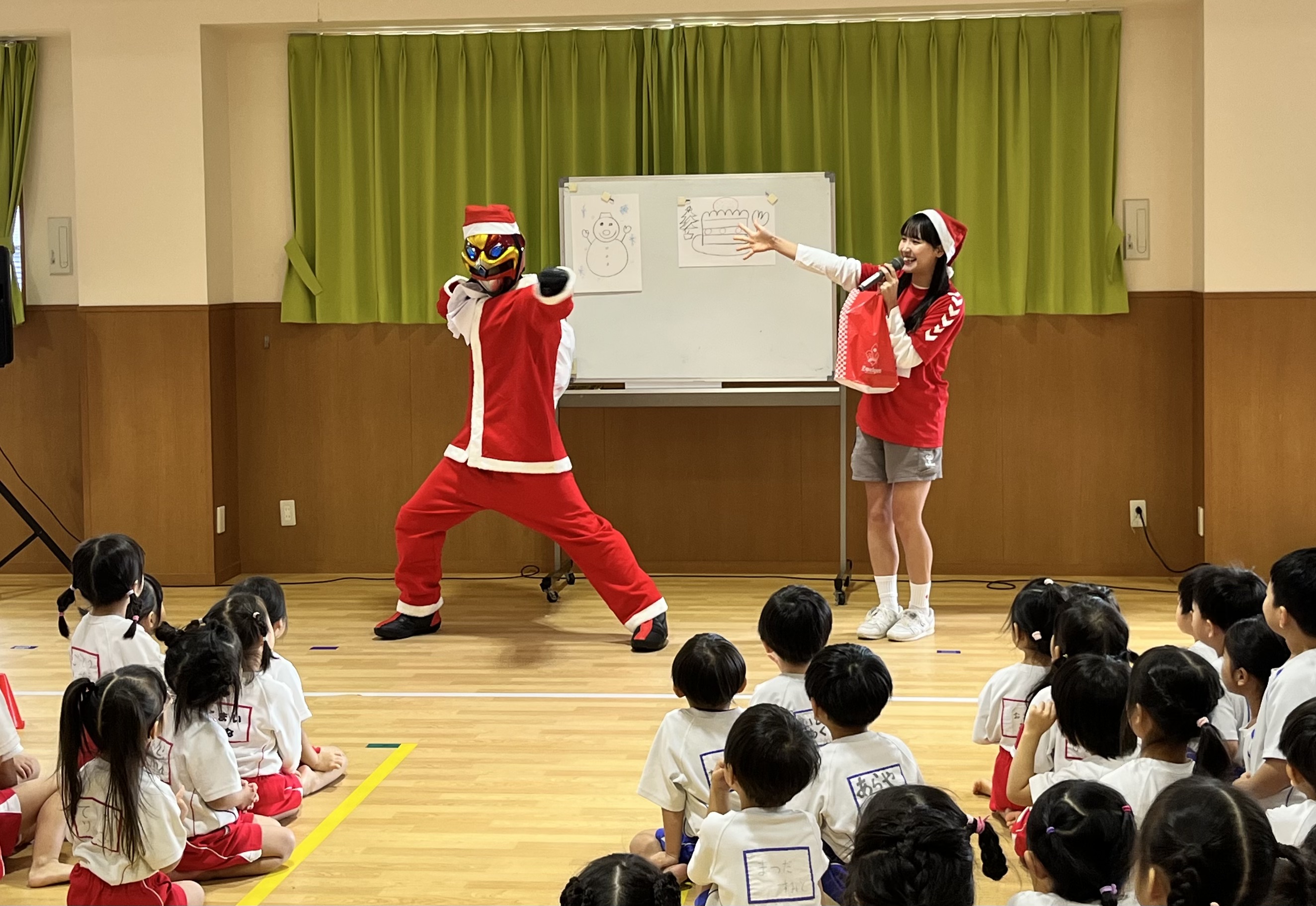 幼稚園では、ゲンゾイヤー体操の前にクリスマス会を実施しており、ゲンゾイヤーもサンタコスチュームで登場!子どもたちへゲンゾイヤーカードのプレゼントをしました。