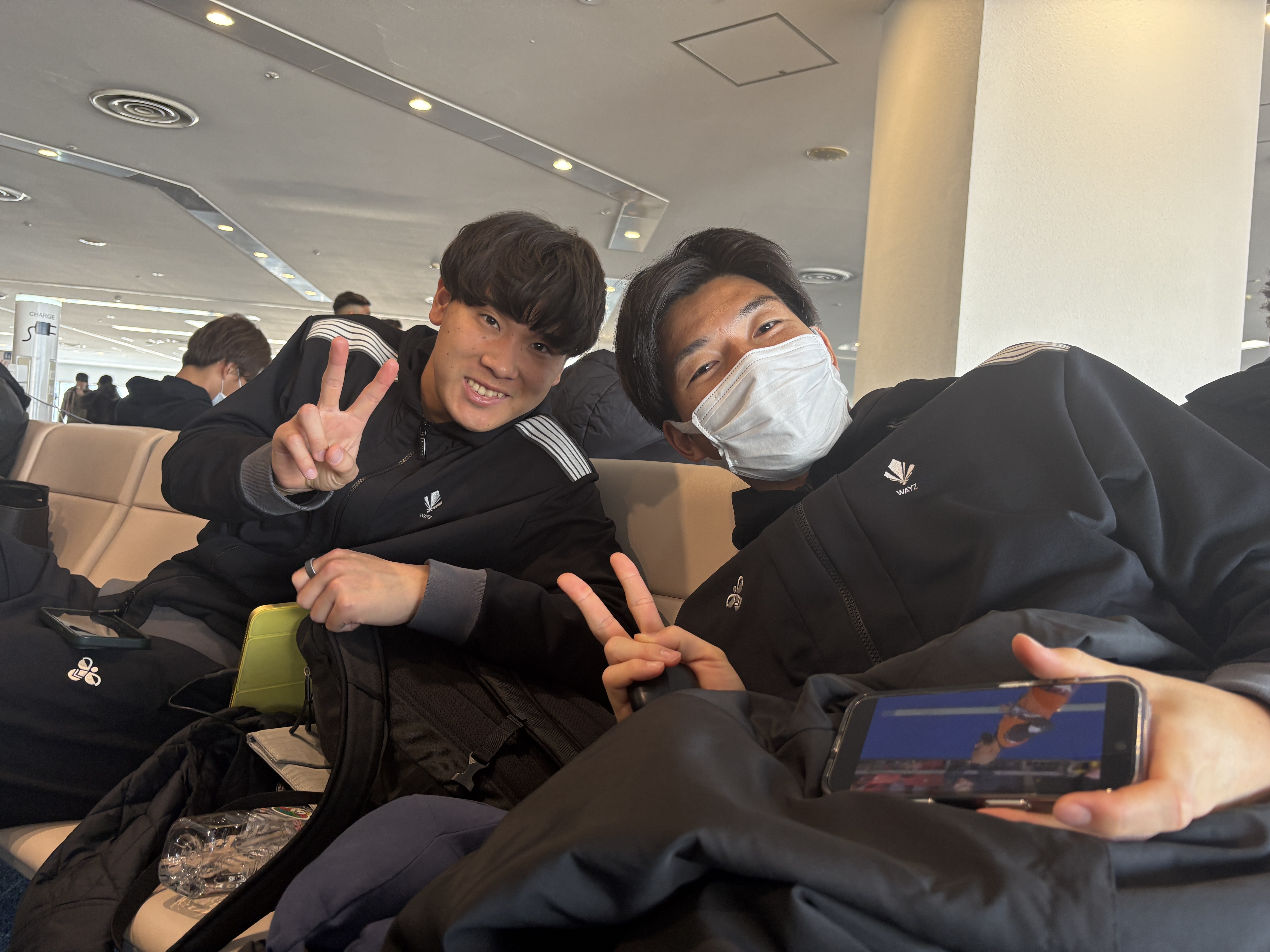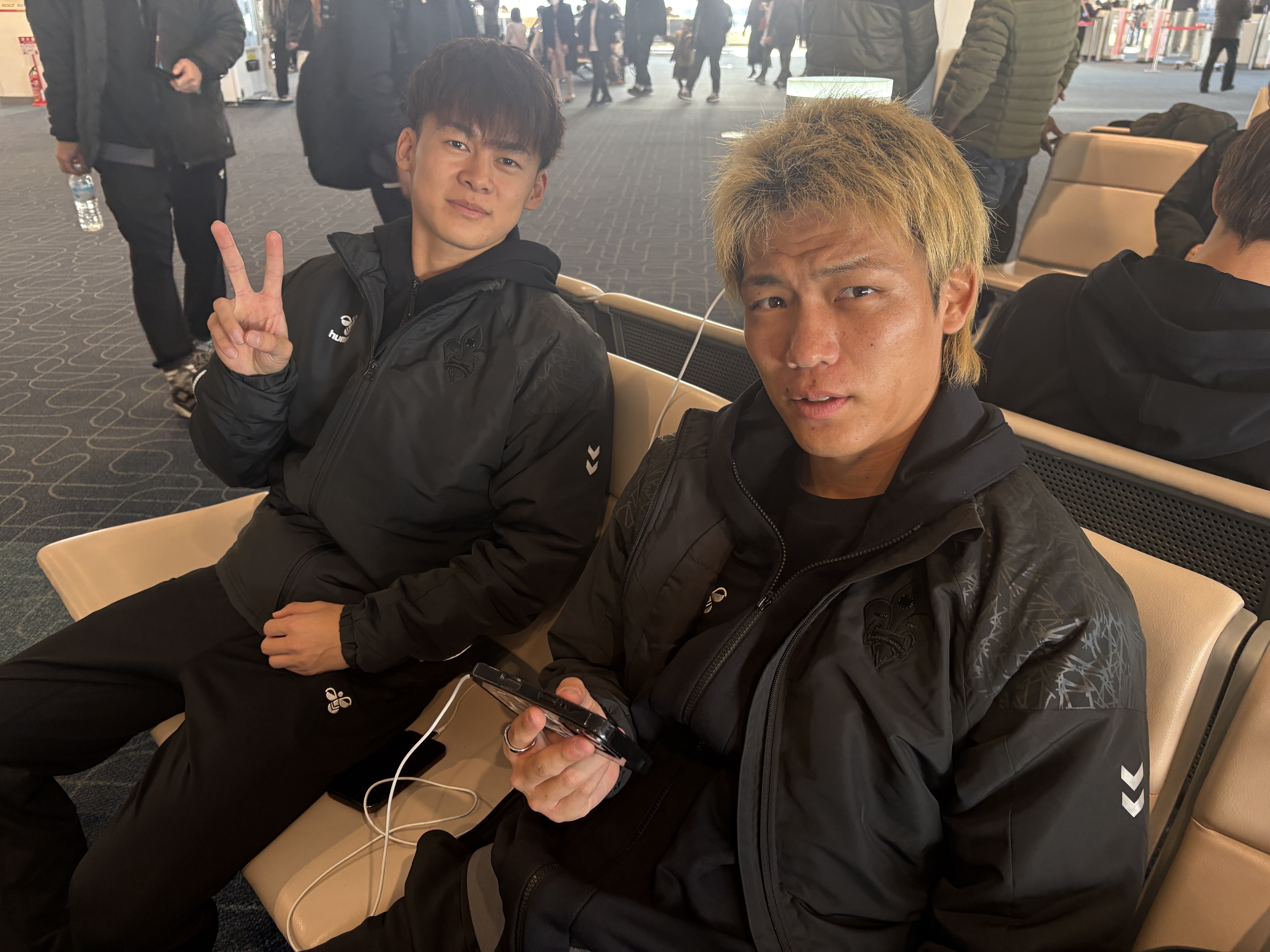 こちらもキャンプに合わせて散髪してパーマもあてた寺阪尚悟選手と、サッカーを見ていた村田航一選手