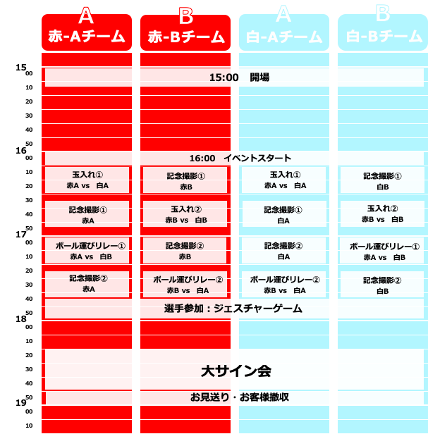 15:00 開場16:00 イベントスタート・監督、選手ご挨拶16:10 第一部「大運動会」スタート18:20 第二部「サイン会」スタート18:50 イベント終了