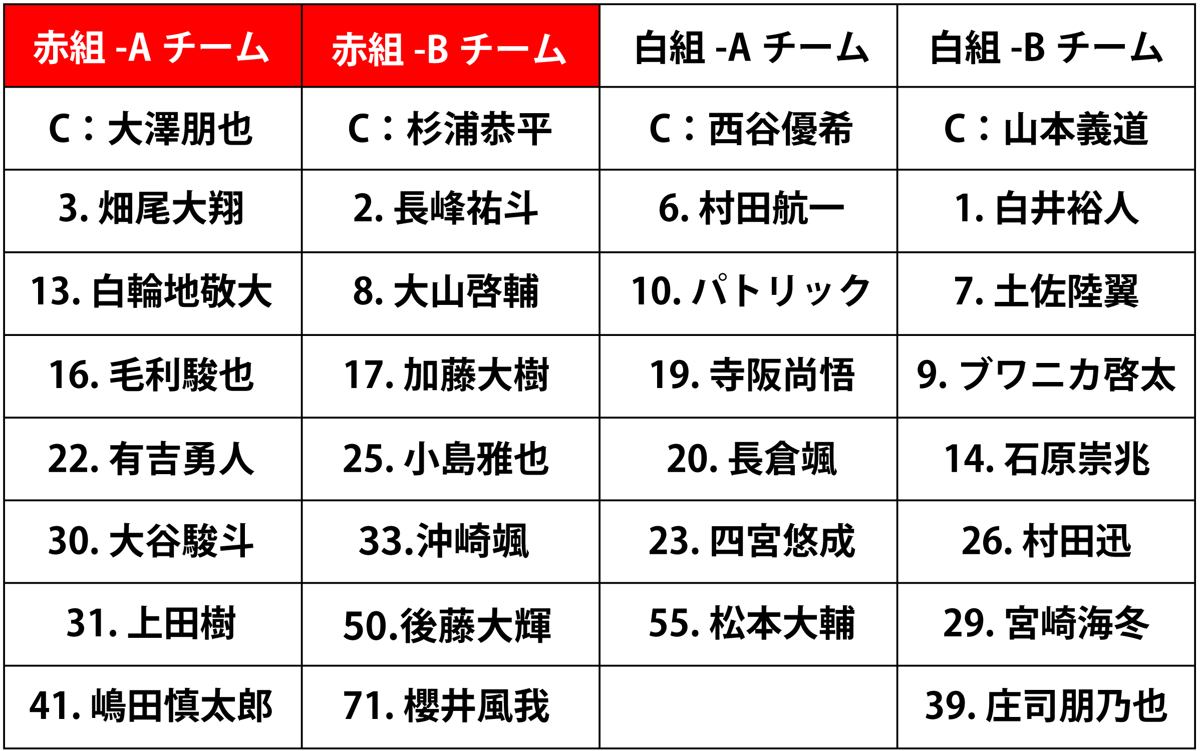 今年のファン感謝DAYは、赤組・白組に分かれて対決を行います。 (それぞれの組をさらに2つに分けて競技を行います。)各チームのメンバーはキャプテンの4選手がチーム決めを実施いたします。チーム決めの様子は後日公開予定です。