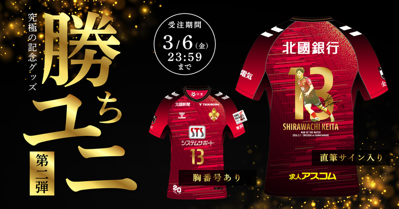 2026.3.4 NEW! 超限定ユニフォーム「勝ちユニ」販売開始!第2回は背番号13番 白輪地 敬大選手に決定!