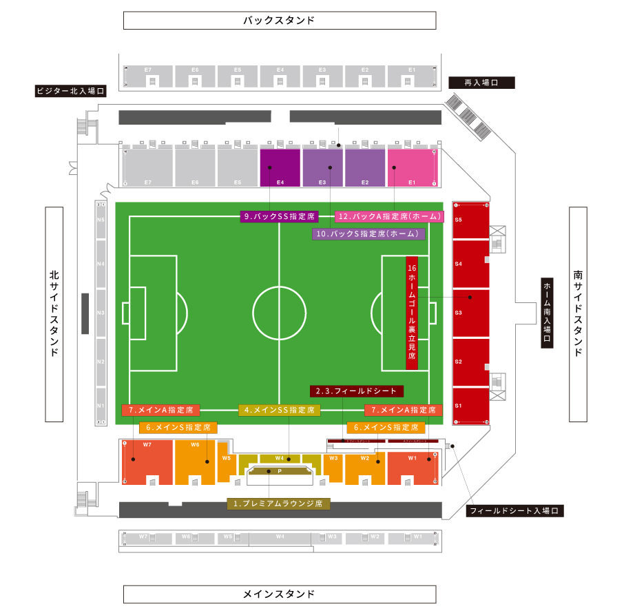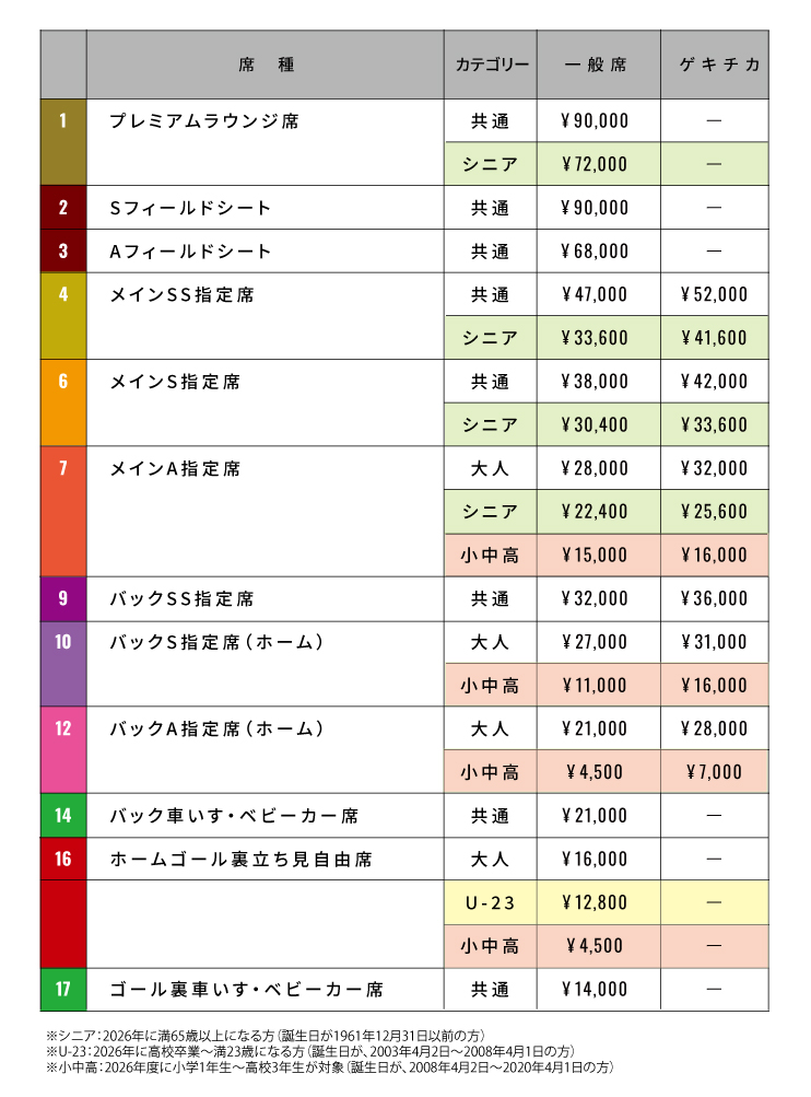 ◾︎席種:メインスタンドの一部「プレミアムラウンジ席、メインSS指定席、メインS指定席、メインA指定席
